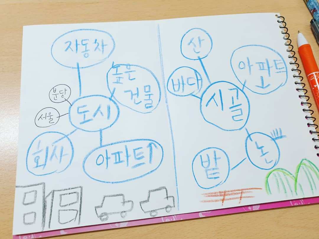 아이들과 적어 본 시골과 도시에서 각각 볼 수 있는 것들.