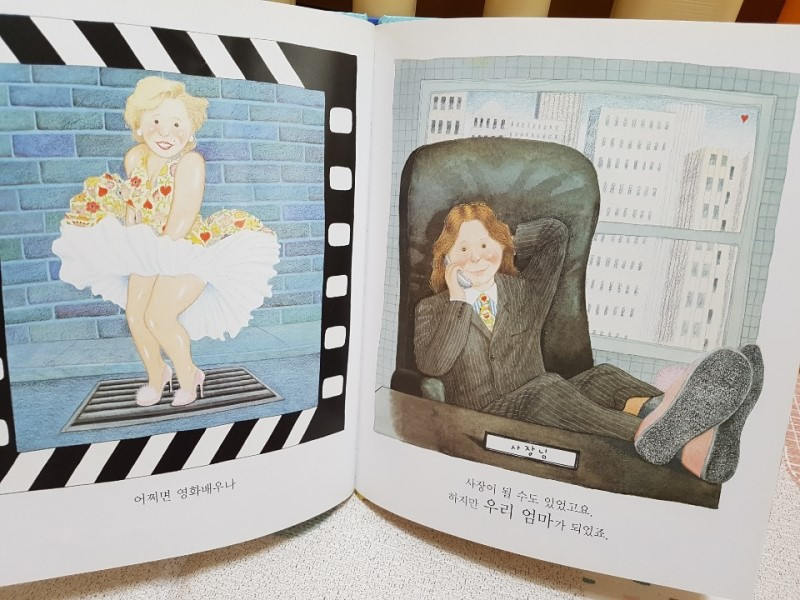 앤서니 브라운의 <우리 엄마> 그림책은 온이가 18개월이 되기 전에 만나게 된 그림책이다. 앞부분은 우리 엄마가 대단한 화가라며, 엄마가 화장을 하는 장면이 나오지만. 뒷 장을 넘길수록 특히 일을 잠시 쉬고 있는 엄마에게는 잊히지 못할 그림과 문장이 보인다. '사장이 될 수도 있었고..하지만 우리 엄마가 되었죠.'