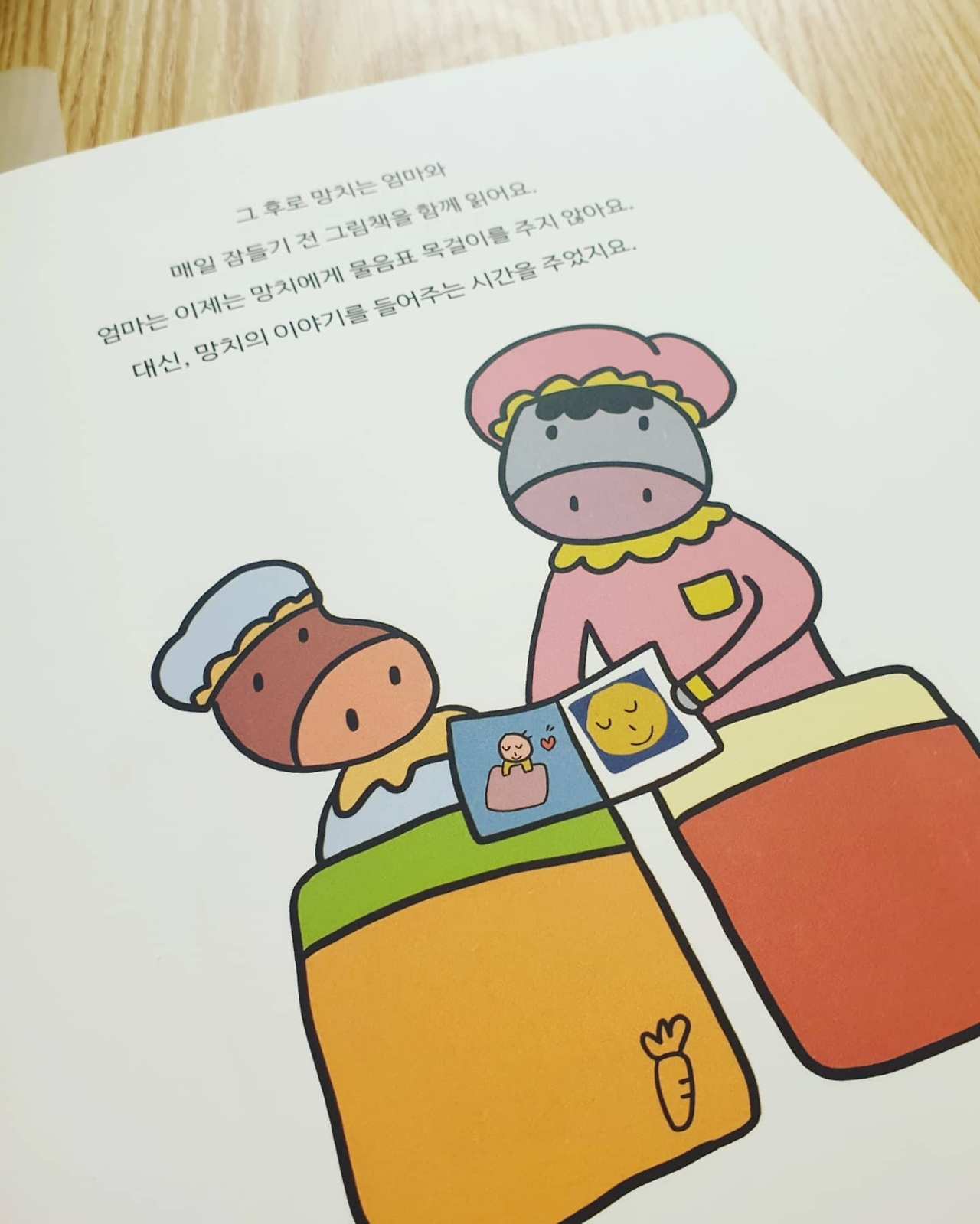 스토리는 엄마, 아빠, 그리고 아이, 이렇게 세 가족이 나오는 이야기다. 주인공을 '말'로 설정했던 이유는 부모님들께 아이의 말을 촉진해주는 방법을 알려드리고 싶은 마음에 자연스럽게 말이 되었다. 이 장면은 그림을 그리고 채색을 할 때 가장 행복함을 느꼈던 장면이다. 엄마는 주인공 망치에게 잠들기 전에 그림책을 읽어준다. 그리고 망치는 하루의 이야기를 엄마에게 전해준다.
