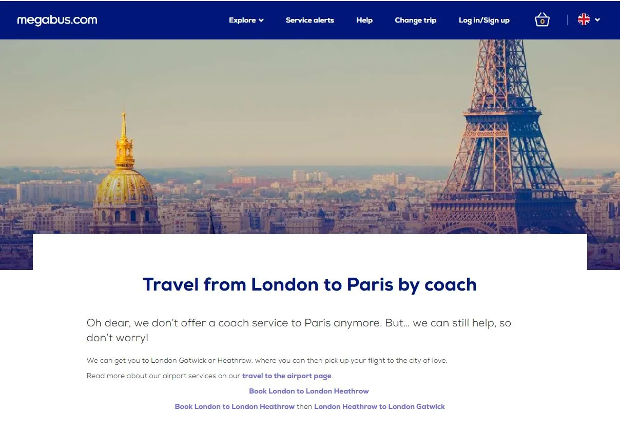내가 탔던 메가버스가 건넌 것이 도버해협이 맞는 지를 찾기 위해 검색을 했더니 이런 화면이 떴다. 무슨 이유에서인지 런던과 파리를 왕복하는 버스 운행을 중단한 것이다. 수지가 맞지 않았던 게 아닐까. 돈을 조금만 더 주면 유로스타를 타고 시간을 세 배 넘게 절약할 수 있으니까.
