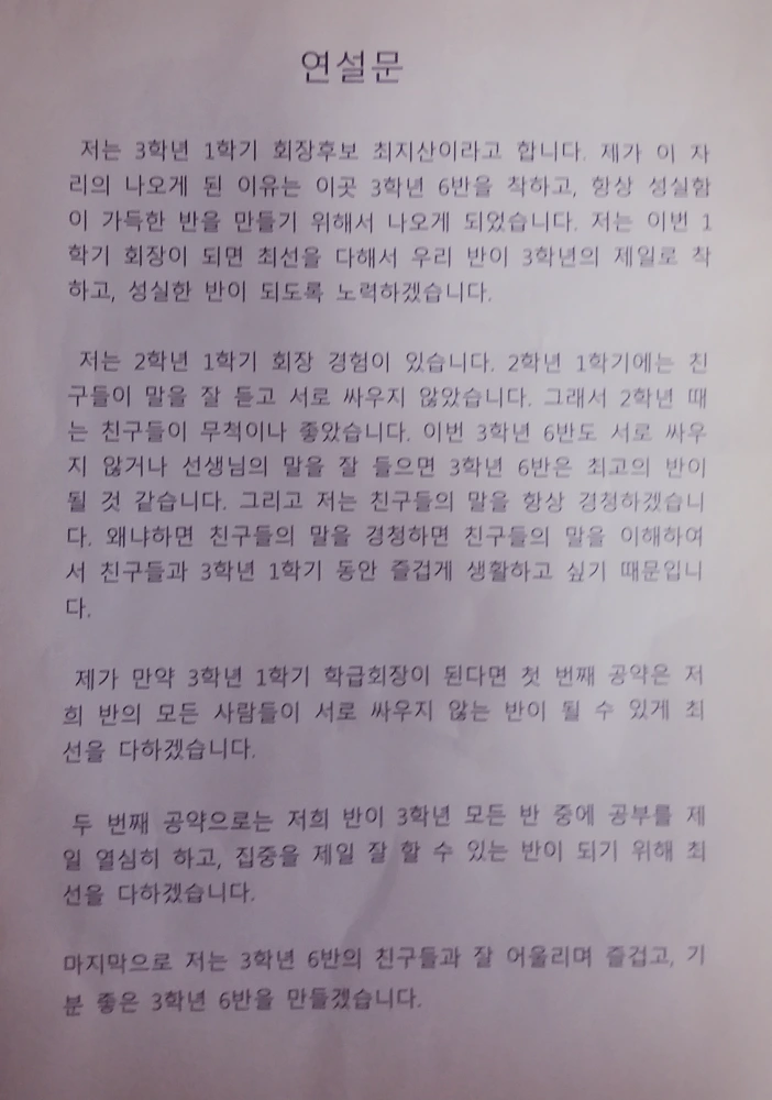 집에 도착하자마자 자기 방에서 워드를 앞에 두고 뚝딱뚝딱 글을 써온다. A4용지 한 장 안에 폰트를 맞게 조절하여 4 단락으로 나뉜 글을 보고 나는 미소를 머금지 않을 수 없었다. 첫째는 상당히 논리 있게 잘 써진 글이었기 때문이었고, 둘째는 적어도 이 글을 쓰기 위해 자신을 되돌아봤을 그 잠깐의 되새김이 기뻤다. 셋째는 내가 전혀 손을 봐주지 않아도 별 문제가 되지 않을 정도의 완벽함이 돋보였고, 넷째는 회장 후보에 나가기 위해 글을 쓰고 암기하여 친구들 앞에서 발표해야 한다는 그 모습에 작은 감동까지 얹어졌다.
