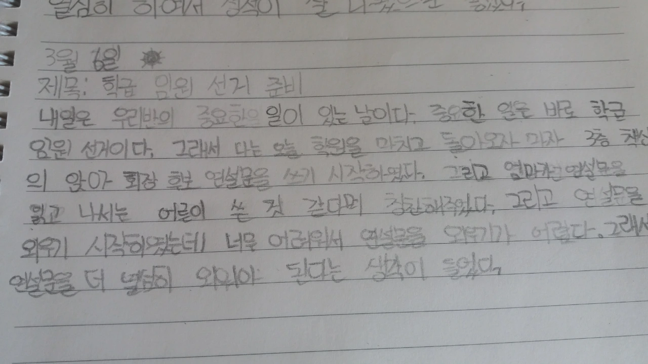 학교를 마치고 돌아온 아이는 무척 바빠 보였다. 바쁜 이유를 들어보니, 내일은 반 임원선거가 있는 날. 전부 완성하지 못한 회장 선거 연설문 원고를 써야 한다는 것이었다. '후보 공약 연설문을 써야 하는데......' 라며 며칠 전부터 공약 발표문을 생각하고 있는 듯한 말을 하기 시작했다. 어디에도 아들이 써 놓은 글을 보지 못했는데, 듣고 보니 워드 안에 작성을 하고 있는 중이라 하였다.