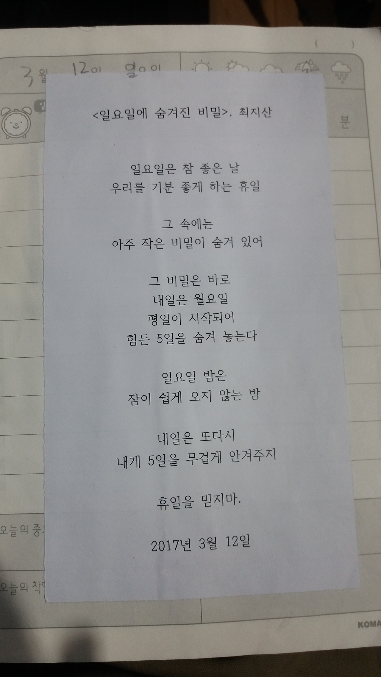 '일요일에 숨겨진 비밀'이라는 시에서는 휴일을 떠나보내는 아쉬움을 표현했고,