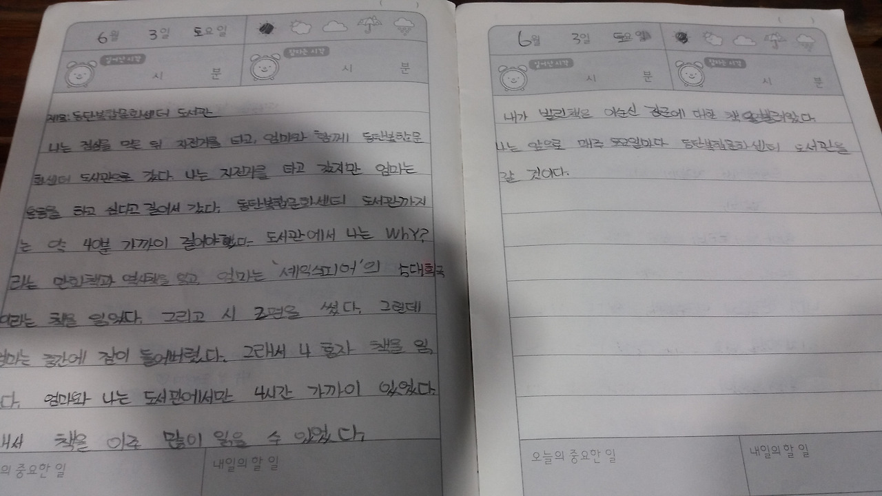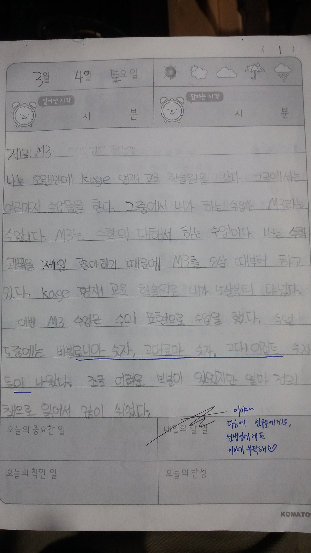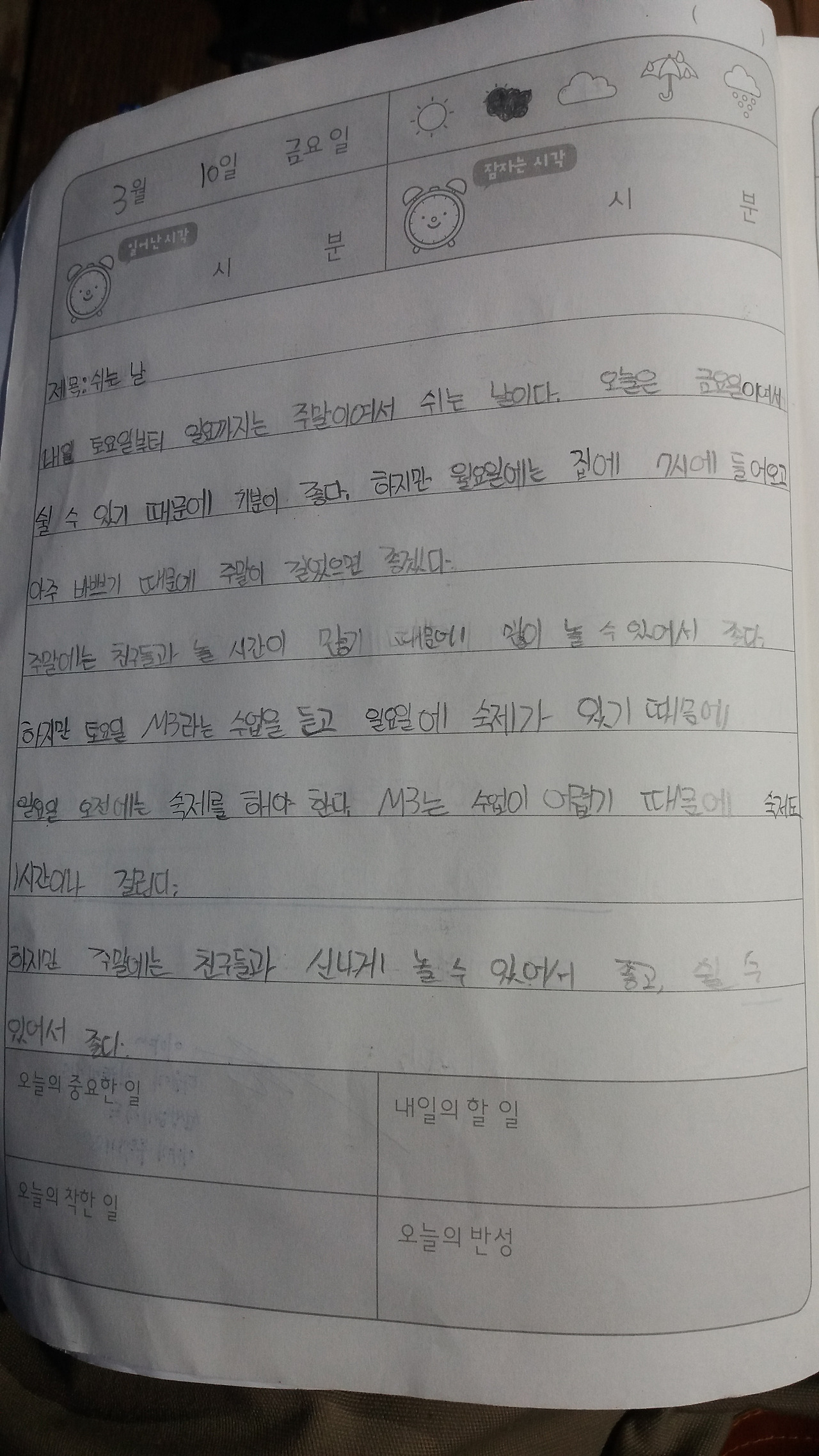 'M3'와 '쉬는 날'이라는 주제로 일기를 제법 내용이 알차게 써 내려가고 있었다.