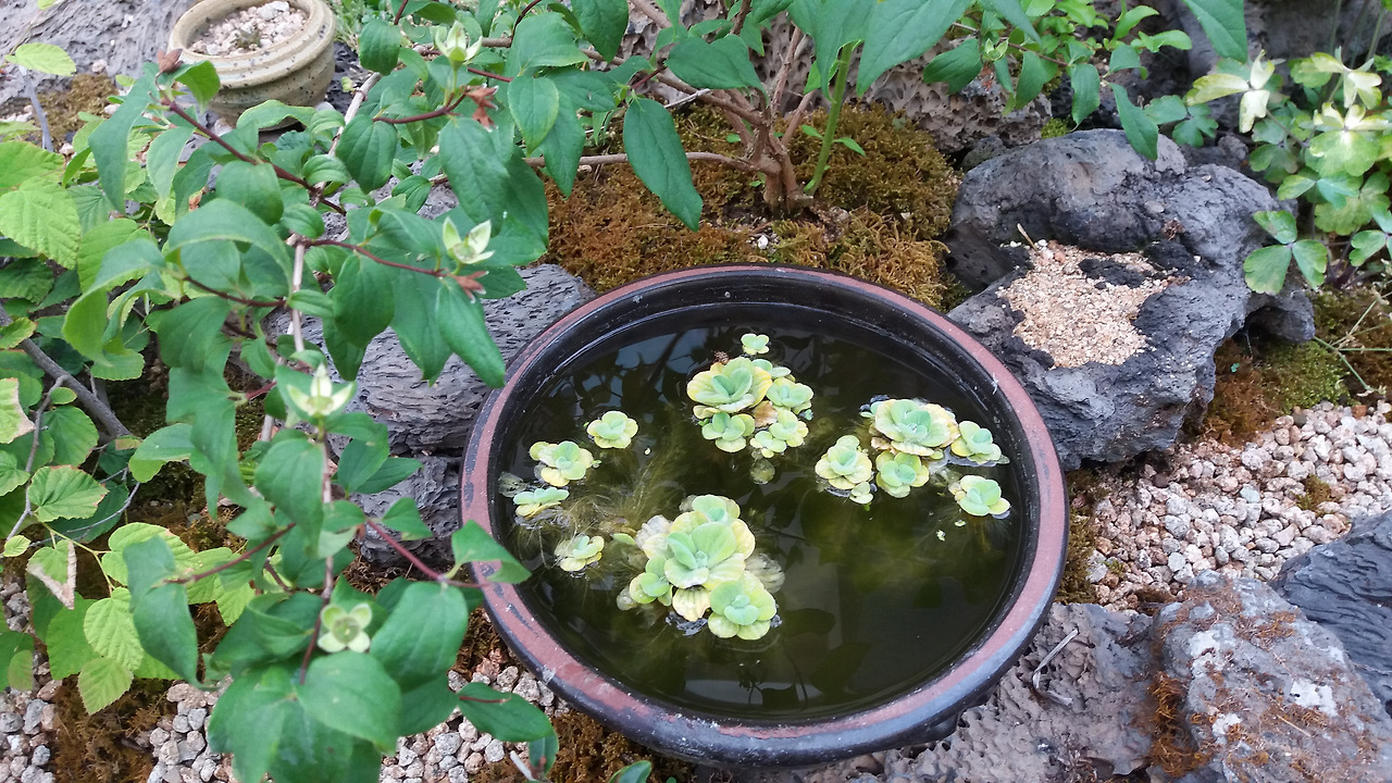 집 주변을 날아다니는 곤충들과 조류과의 녀석들이 더위에 지친 날개를 접고 물을 한 모금씩 담고 가는 정원 수반 옹달샘이다. 물배추가 땡볕 속에서 자리를 넓혀가고 있다.