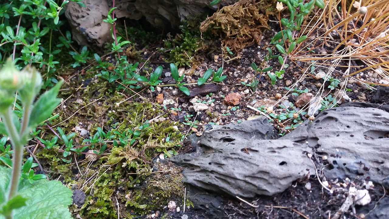 벌써 씨를 받은 화산석 사이 흙은 새싹을 품고 있다.