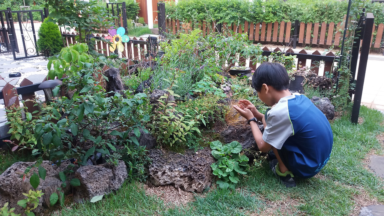 <아이는 정원의 야생화 씨앗을 받으며 자연을 만나고 있다. 2017년 6월 20일>