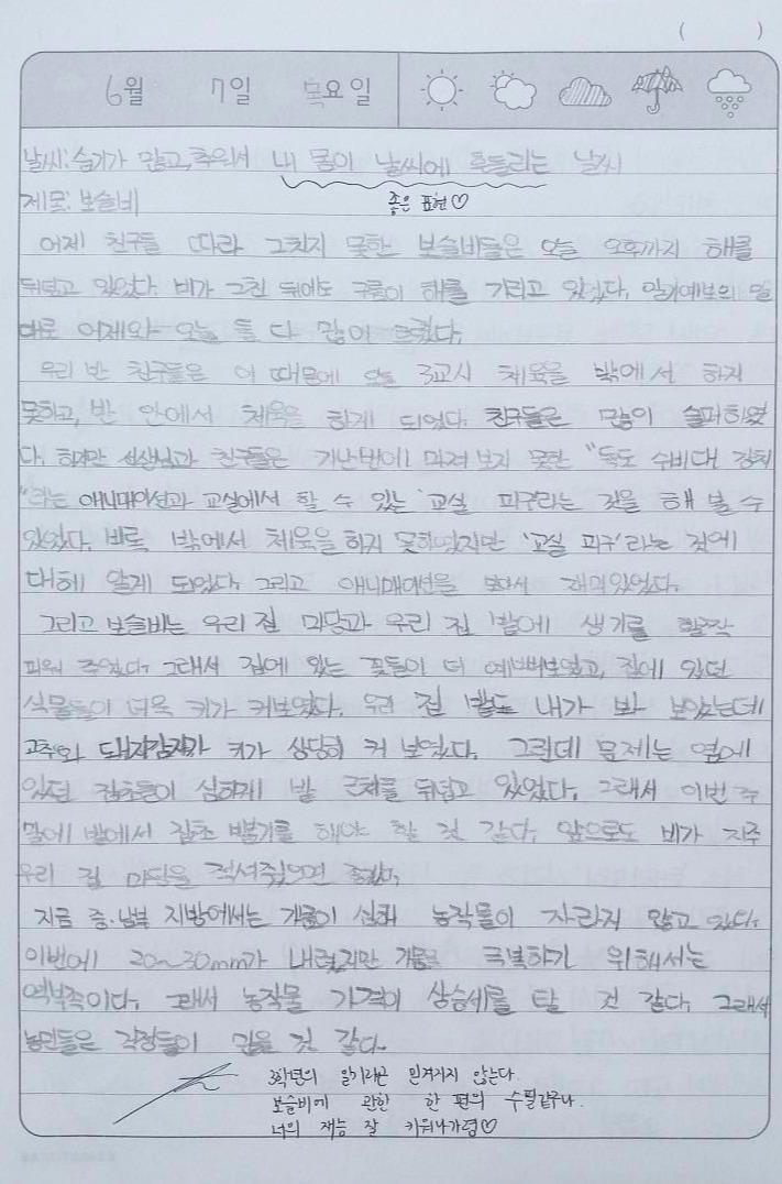 라고 담임 선생님께서도 읽은 엄마의 마음과 비슷하게 평을 해 주셨다. 상담 때에도 말씀하셨듯이 아이의 글 감각을 계속해서 칭찬해주고 계신다.