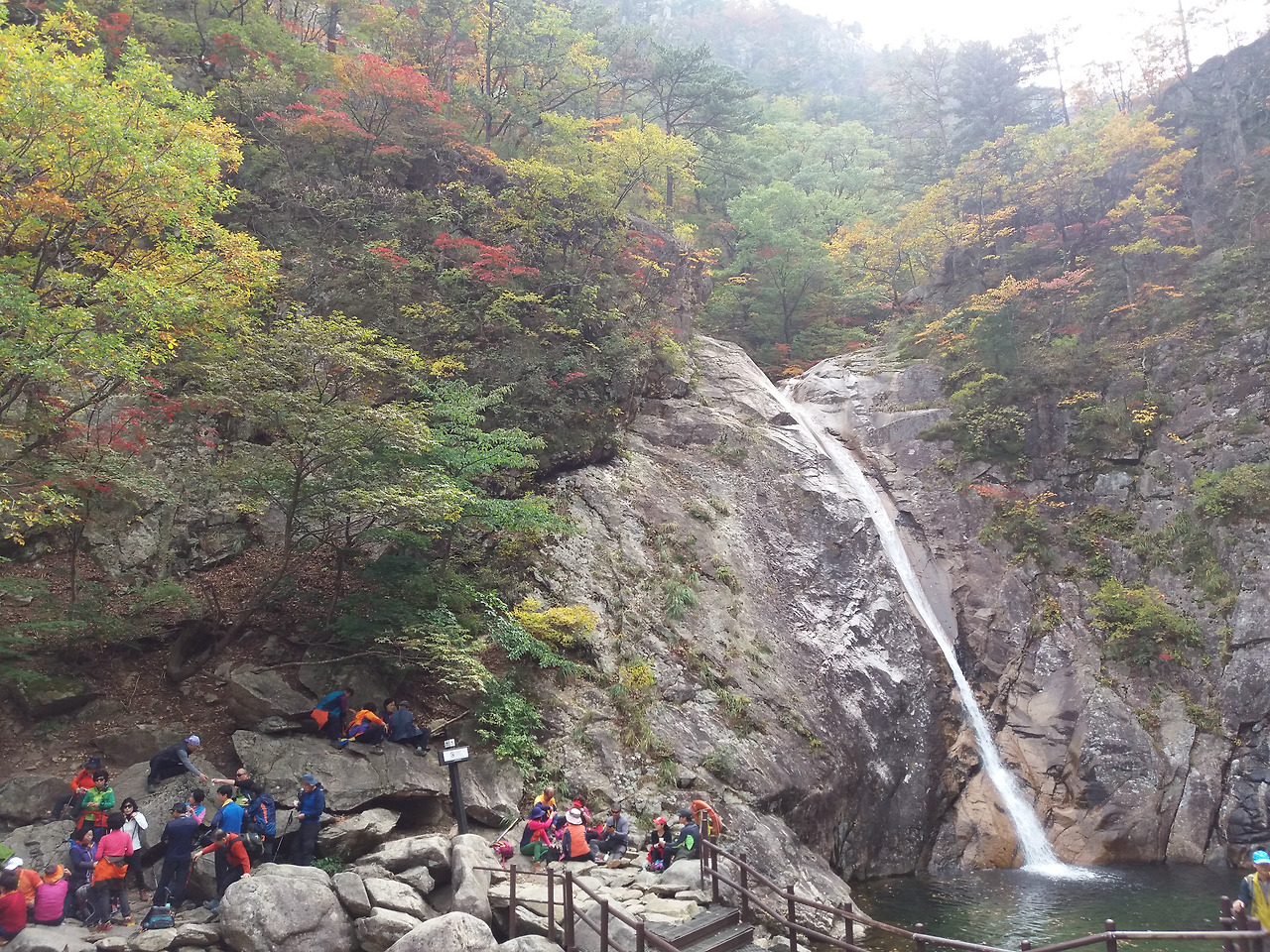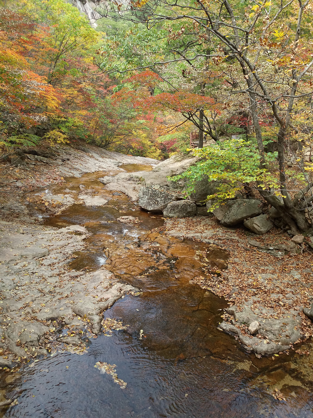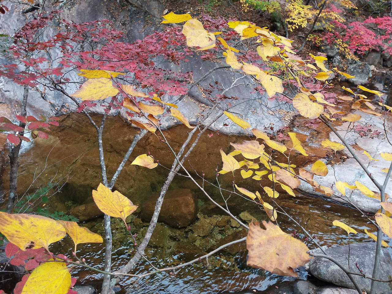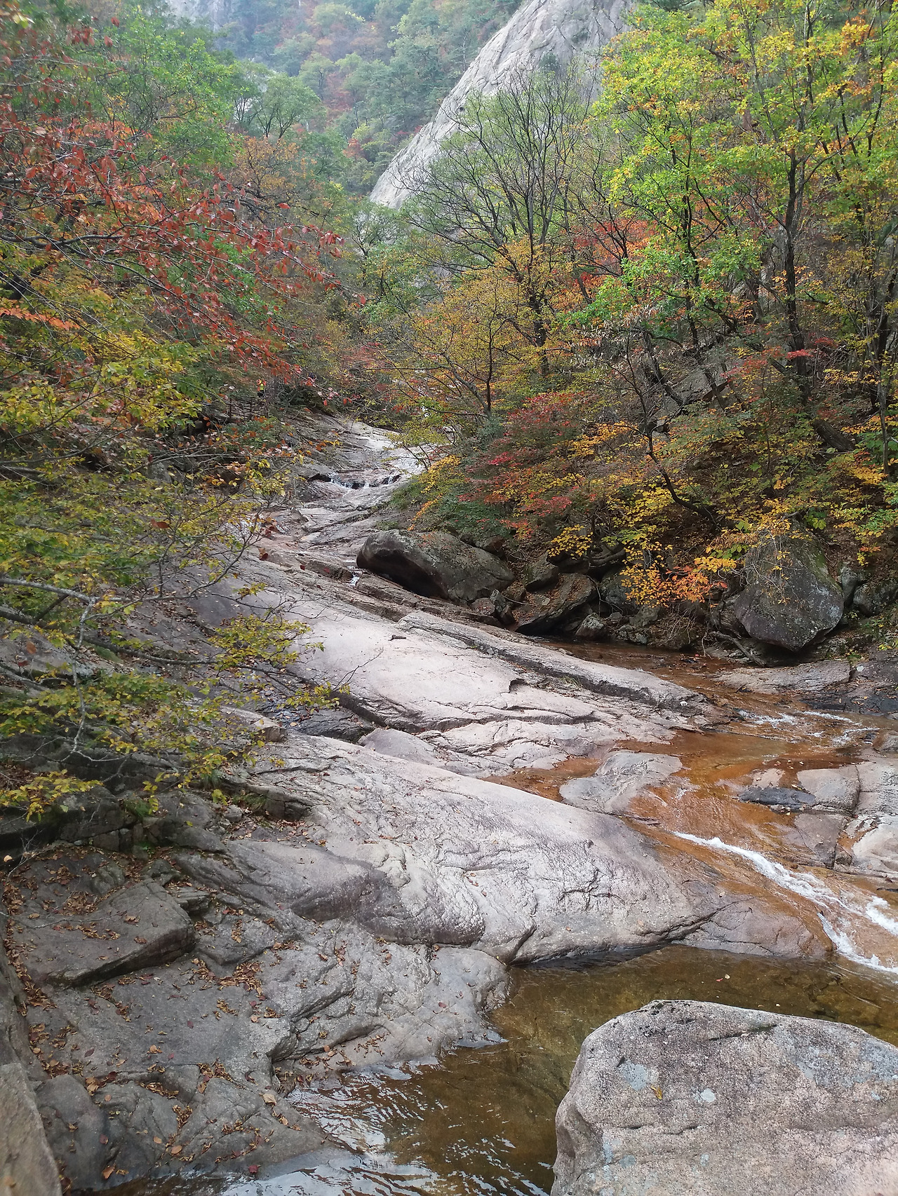 비룡폭포로 향하는 길은 편안한 길이었다. 난이도가 낮은 보통 길. 몇 군데 철제 계단과 오르막을 통과하면 되는 정도였다. 내 수준과는 거리가 멀 듯해 보였지만 그래도 표지판을 보니 안심이 되었다. 산책을 위한 산책으로 이 가을을 넘기고 싶었다. 깎아지른 산길 속에 내가 있다. 울긋불긋 기암괴석의 틈새 사이로 보이는 가을을 온몸으로 맞이했다.