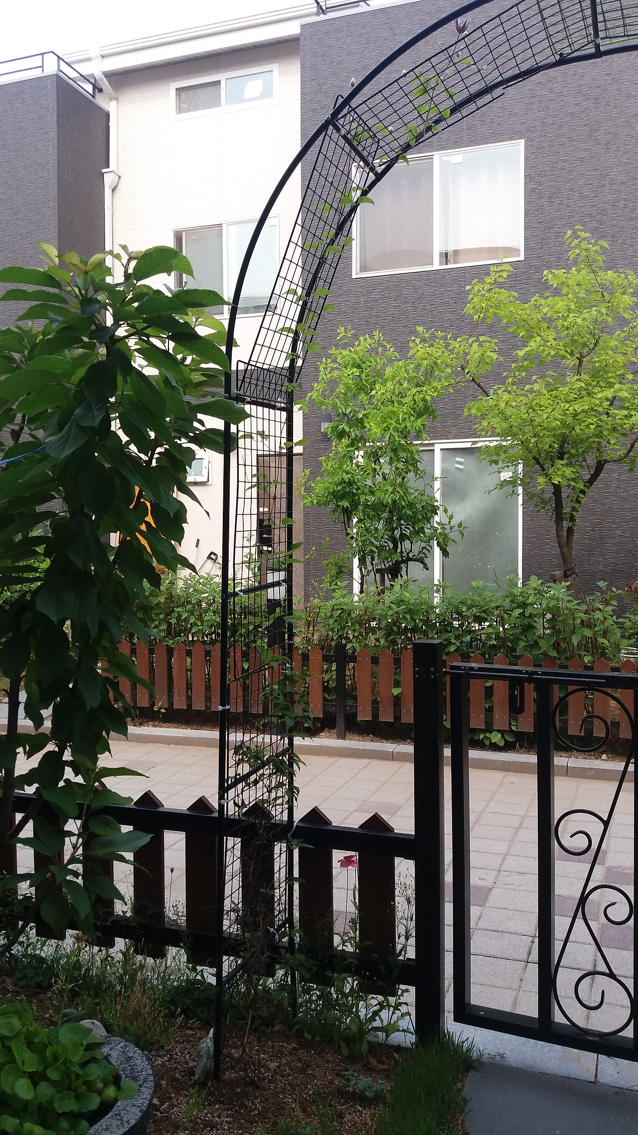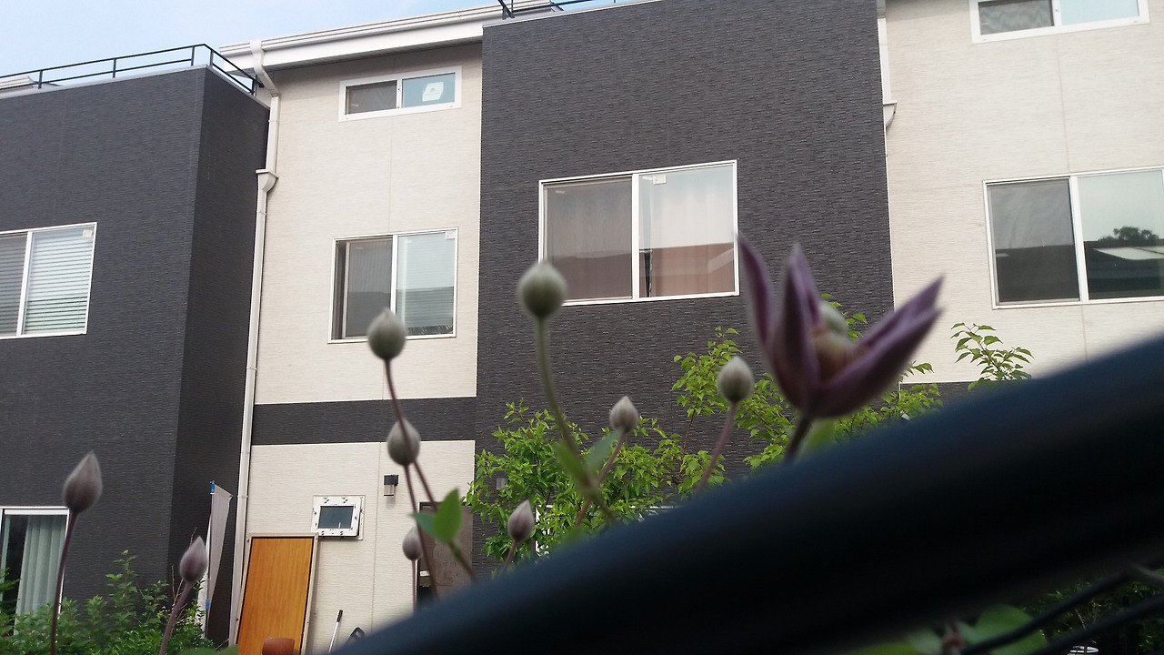 클레마티스(큰꽃으아리)와 몬테나으아리가 섞어져 넝쿨을 이루고 있는데요. 이 녀석들 때문에 만든 아치에서 4월에 꽃을 한 번 피어주었고요. 다시 7월이 가까워지니 다시 한번 꽃대를 올려 꽃을 피우고 있습니다. 저 위에 꽃봉오리가 하늘을 향해 오르고 있네요. 키가 닿지 않아 의자를 받쳤음에도 사진이 잘 잡히지 않네요.
