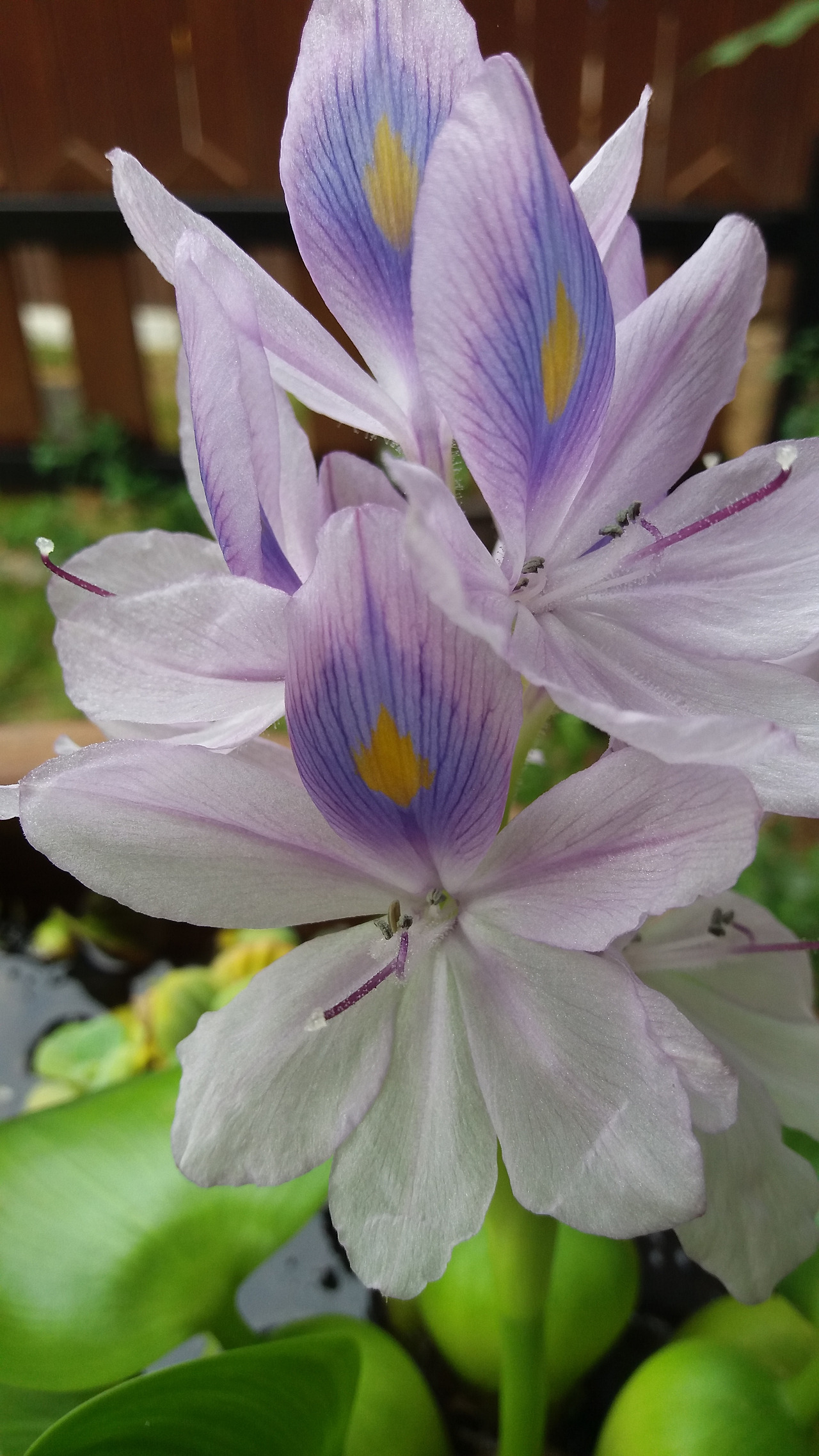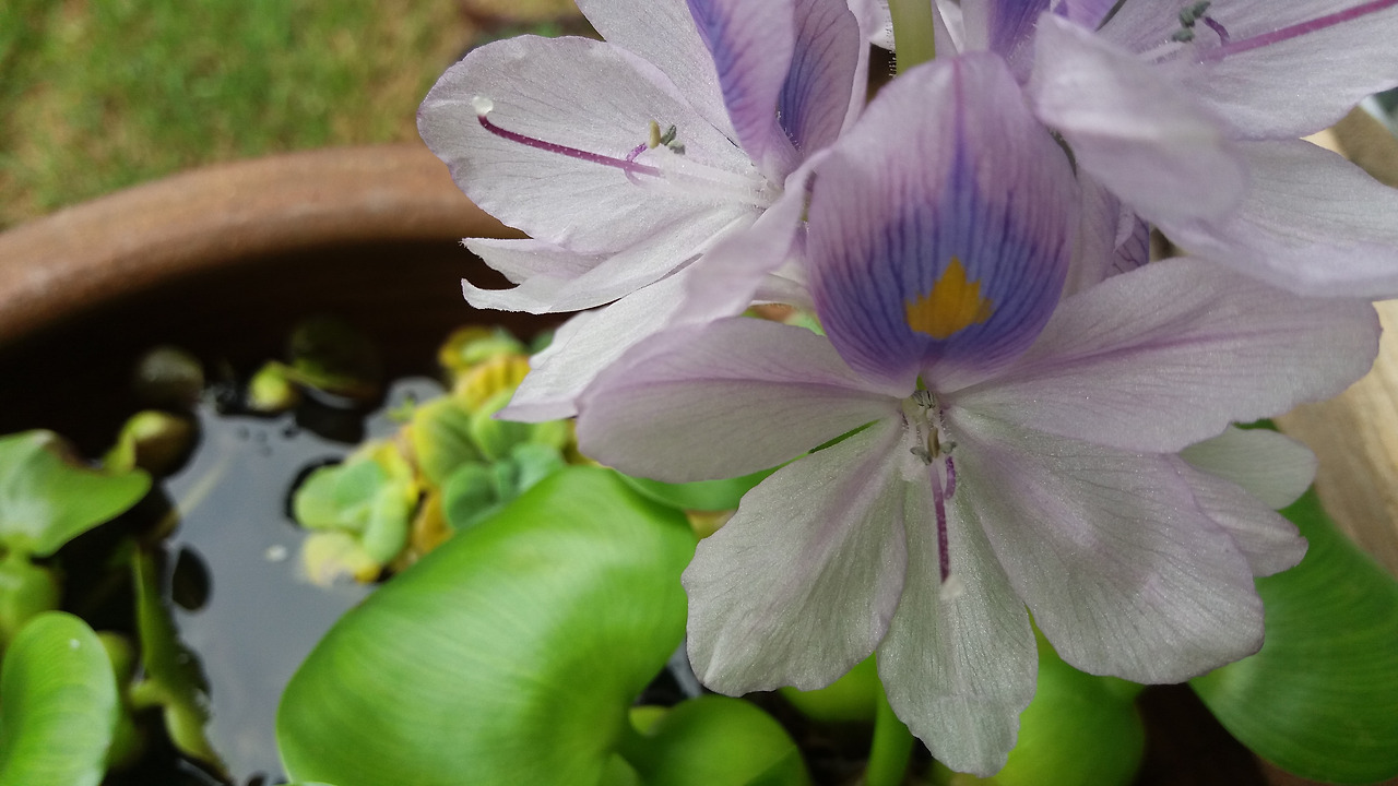 소박한 흰 바탕의 꽃잎 색감이 전체를 감싸고 보랏빛과 노란색을 뿌려놓은 듯한 부레옥잠의 꽃잎이 신기하다