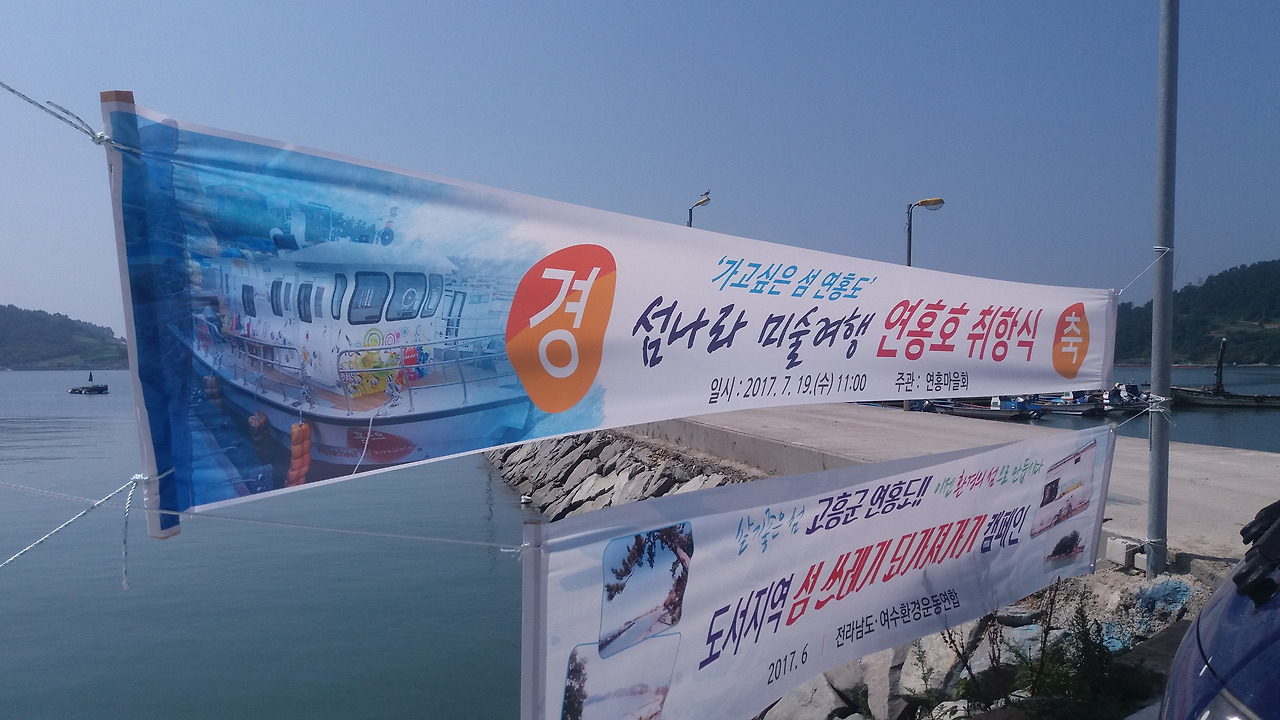 '가고 싶은 섬 연홍도', '섬나라 미술여행'이라는 주제로 현수막이 걸려 있었다. 연홍도 배가 정식 취항을 한 모양이다. 지금까지는 주민들과 홈페이지만 알고 있는 시간에, 주민들만 알고 있는 선장님의 핸드폰으로 전화를 해서 인원수를 말하고 '이윤이 남을 선의 인원이 되면' 건너와주며 운영되었던 것 같다. 나도 전화를 해 보았다. 먼저 인원수부터 묻는 선장님. 적은 수의 3명이라서였을까? 도항 시간 기다리셨다가 오라는 답변이었다. 그런데, 연홍호가 취항이 되었지만 시간이 적혀 있지 않았다. 고깃배에서 조업을 하시는 분들에게 연홍호의 시간을 물어보긴 했지만, '곧 올 겁니다.'라는 말이 전부였다. 다시 데이터를 켜고 검색을 해야 하는 불편함을 두세 번 주었다.