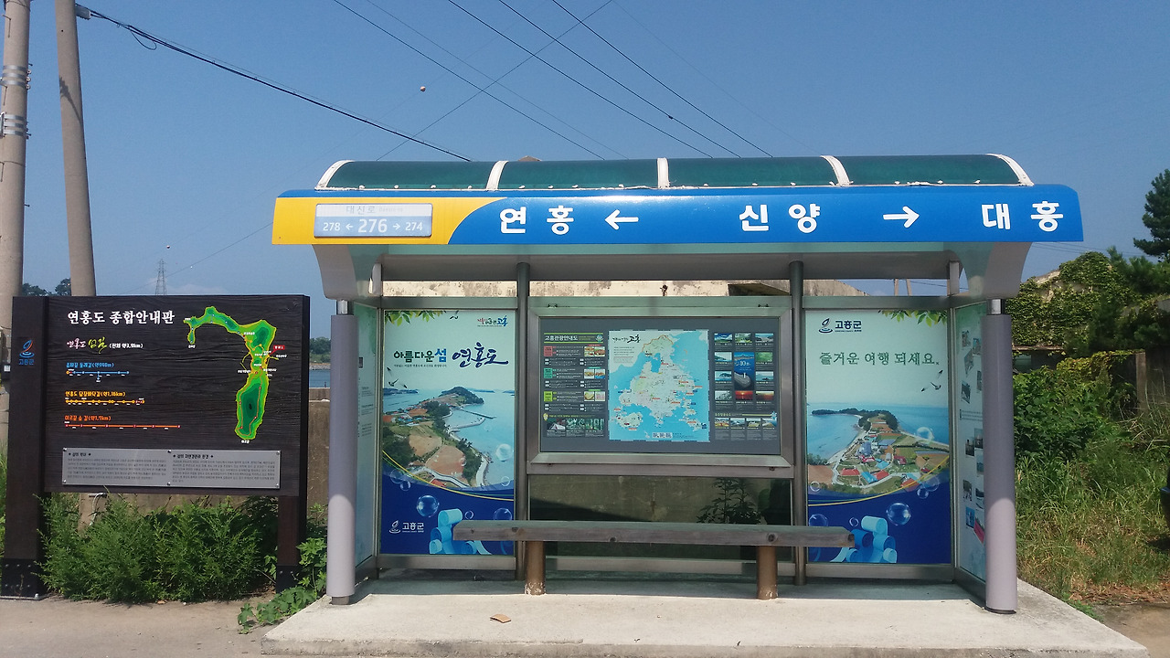 불화살의 열기는 섬을 둘러싼 바다 곁에서도 예외는 아니었다. 신양 마을 부두에 도착하자 마을에 대부분 하나씩 있는 버스 정류장이 눈에 띈다. 누구도 서 있지 않지만 태양의 외줄기 시선을 또렷이 받는 바닷가 옆 정류장이다. 연홍을 가기 위해서는 바로 옆 부두에서 배를 타야 한다는 말은 없었다. 지도와 그림 하나로 유추해야 한다. 아는 사람만 아는 이정표다. 이곳은 나름 어려운 숙제를 풀라 하듯 연홍도를 들어가기 위한 부두의 시작임을 알리는 셈이었다. 화살표 하고 '연홍도 행 선착장'이라 해줘야 맞지 않겠는가! 이정표대로 가면 바다에 빠진다!