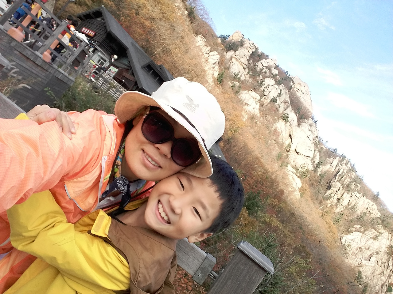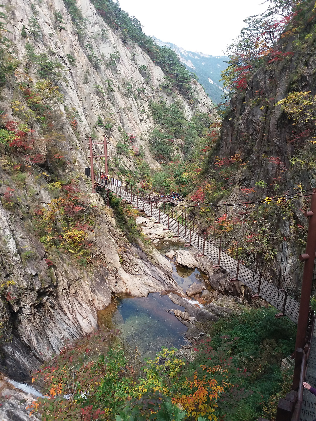 기암괴석 저쪽과 이쪽에 연결되어 심하게 흔들거리는 흔들 다리는 비룡폭포를 200미터 정도 남기고 아슬아슬하게 걸쳐 있었다. 사람들이 지나가는 데도 가는 길을 멈추고 흔들거리며 즐거워하는 아들이었다. 영락없는 어린아이의 동심을 지키고 있었다. 지나가기도 무서운 나는 그러지 말 것을 아이에게 주의를 시켰고, 걸쳐 있는 줄을 잡고 걷느라 다리 위에서 가을을 담을 수가 없었다.