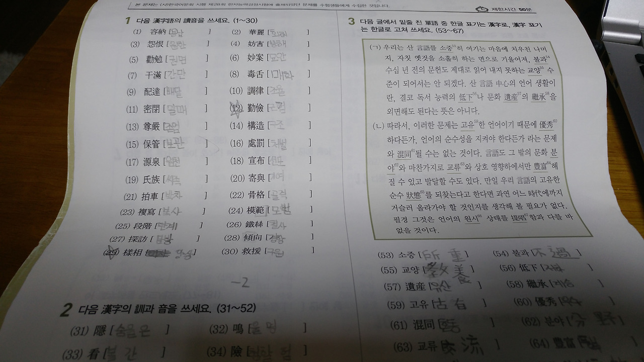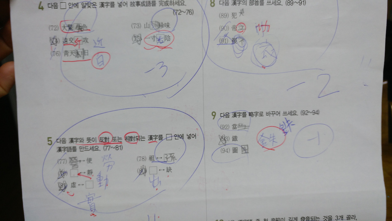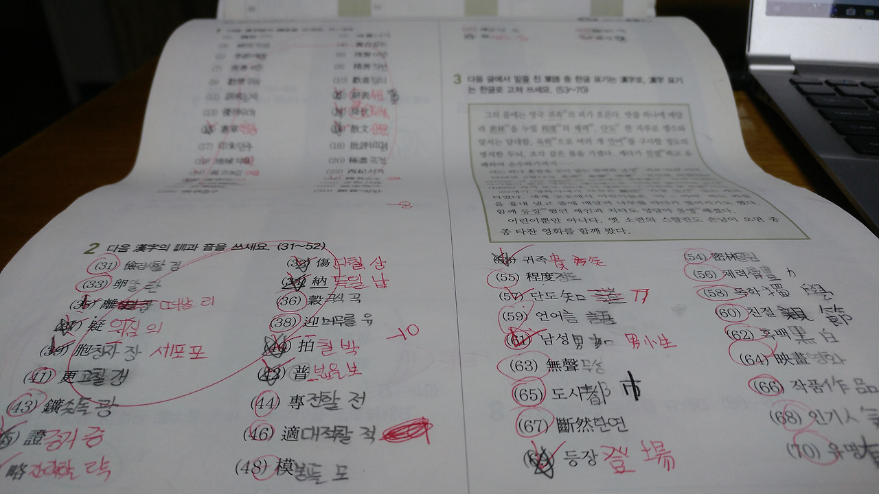그런데 11월 25일, 79회 한국어문회 4급 한자 시험을 끝내고 나오는 아들의 얼굴에는 웃음꽃이 가득 피어 있었다. 5문제 정도만 모르고 대부분 채워 넣었다는 말이 신기할 정도였다. 일주일 전까지만 해도 낙엽이 우수수 땅으로 날려 내려오는 형국이었다. 마냥 정답이 보이지 않았던 날들이었다. 3일 전부터 특훈으로 함께 공부를 한 덕분이었을까. 오답 한자를 위주로 다시 익히고 익히면서 설명을 덧붙여 주었다.