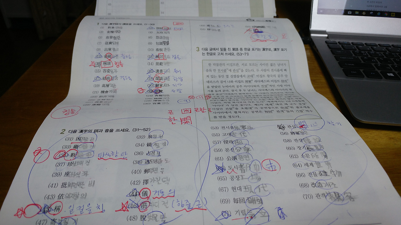 예를 들면, 권할 권(勸)과 근면할 근(勤)이 몹시 헛갈렸던 아들에게 "사람들이 권할 때 말을 많이 하잖냐. 그래서 입 구(口)가 두 개 있는 것을 권할 권으로 외워라."라고 했더니 "엄마의 그 설명 아주 좋네요."하며 "엄마와 남은 시간 동안 같이 공부를 해야겠어요."라고 하며 책상 위에 머리를 함께 기댔었다. 시험 전날은 답안지를 옆에 두고 하나하나 보면서 문제를 적는 것으로 집중력을 올려보았다.