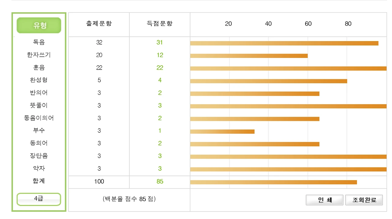 합격 발표날인가 보다. 어느새 한 달 전 일들이 추억으로 묻혔는데 문자로 합격 소식을 알려왔다. 생각보다 높은 85점으로. 시험 일주일을 남겨 놓고 70점 선을 넘거나, 심지어 넘지 못할 때도 많았는데 대단하다.라는 말이 입속에서 웅얼거리고 있다. 심지어 준 4급에서 얻은 84점보다 점수가 높다. 쓰기에서 많이 오답이 나오는 것은 당연하다고 본다. 다른 영역에서 고루 점수를 획득한 것은 집중 훈련 덕분이었으려나!