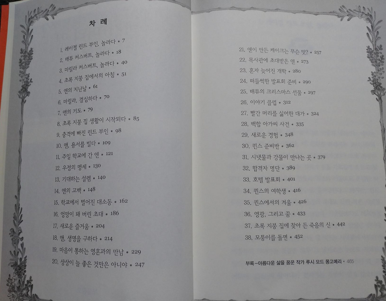 집에 있는 또 다른 '빨간 머리 앤(2002년에 출판)'의 목차이다. 두 번째 '레드먼드의 앤'을 다시 읽고 있는 중에 글을 작성하게 되어 사진으로 남겨보았지만, 다양한 번역본을 본다는 그 자체가 설렘이고 기쁨이 아닐 수 없다.