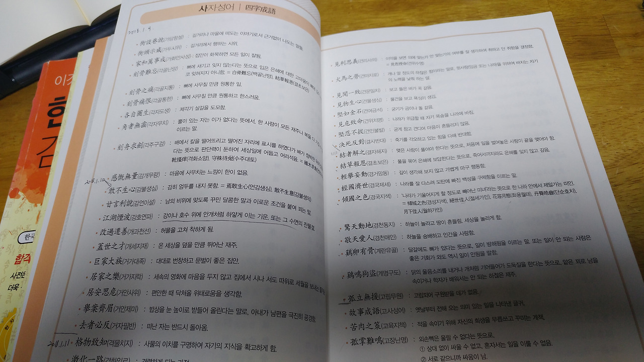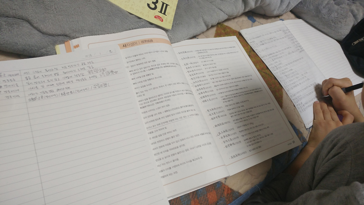 남편의 퇴근이 들쑥 거릴 땐, 남편이 오는 것을 확인한 후 아들과 함께 자리를 피해 공부를 시작했다. 사자성어를 10개씩 적고, 그리고 뜻을 제대로 알고 있는지에 대한 확인을 각자 했다. 그리고 난 후, 매일 학습으로 15자의 읽기 한자와 쓰기 한자를 섞어 노트에 적어 내려갔다. 어릴 때 많이 쓰던 깜지 형식과 비슷했지만, 잊고 지낼뻔한 한자를 다시 보니 기분이 좋아졌다. 획순도 엉망으로 알고 있었던 것을 다시 정정하며 배우는 즐거움이 행복했다. 아들은 엄마와 함께 스텝을 맞춰가며 써 내려가며 경쟁을 한다. 나는 아들과 경쟁을 할 이유는 아무것도 없지만, 학습 동기를 부여하는 차원에서는 내가 더 열심히 하는 척(?)을 부리지 않으면 안 된다.