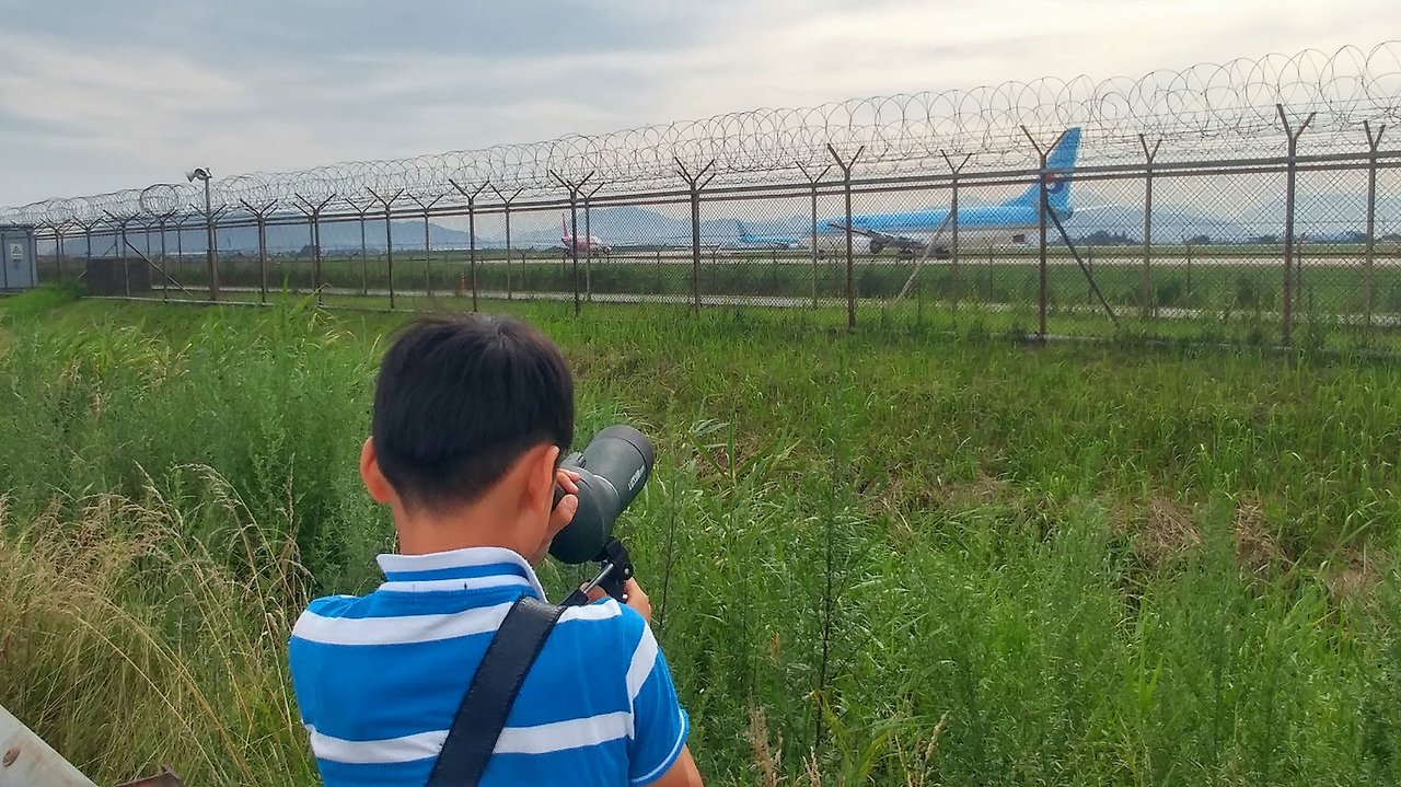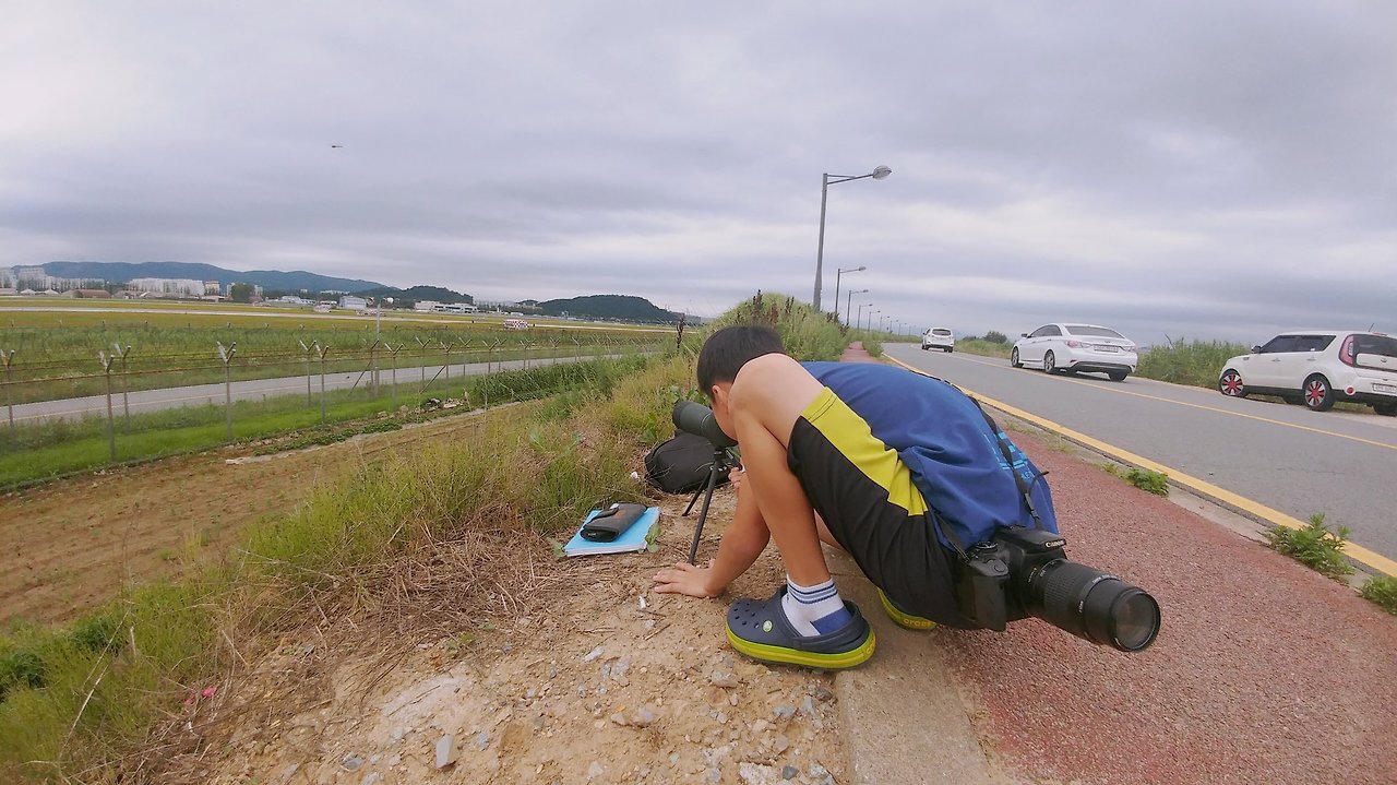 이틀 사이에 경상도까지 멀리 달려온 만큼 아들은 [김해공항]을 기대하고 있는 듯했다. 공항의 규모의 문제라기보다 평소 편하게 접근하지 못했던 지역이기에. 김해공항 주변 변두리에는 기업 건물이 대거 밀집해 있었다. 김해공항 주변에는 안전하게 공항 활주로를 바라볼만한 장소가 변변치 않았다. 먼지가 날리던 도로변 건물 앞에 자리를 잡고 망원경과 카메라를 들고 비행기의 엔진을 보는 아들이 진지해 보이지 않을 수가 없었다. 차량 통행이 잦았던 좁은 2차로는 도로 안전을 확보할 수 없었던 것이 아쉬움으로 남았다.