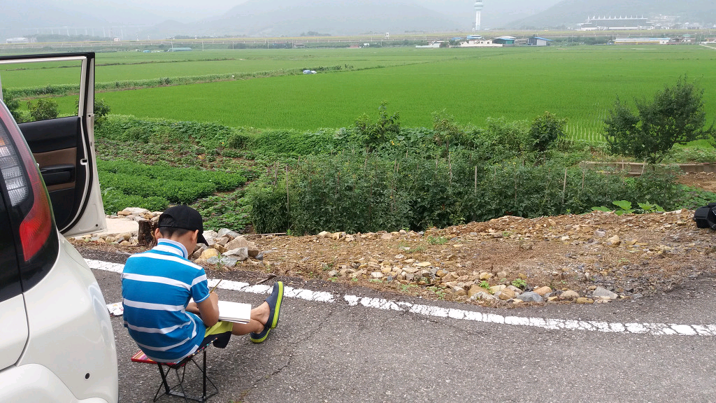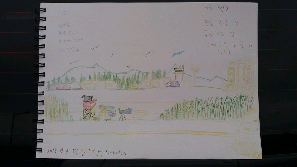 [광주공항]을 향하면서는 구름이 드리운 하늘의 풍경에 감사하지 않을 수 없었다. 광주 역시 군사공항으로 인해 사방이 높은 벽과 철조망뿐이었다. “여기요. 아니요. 저기요. 좀 더요. 더! 더 가세요. 우회전이요. 좌회전이요.” 라며 아들은 이미 안내자가 되어 있었다. 나는 운전만 열심히 하는 택시 기사 엄마가 되어 좁고 굽어진 황룡강 길을 따라다녔다. 광주공항이 한눈에 보이는 곳에 차를 멈췄다. 비행 모습이 자주 오지는 않았지만 바람의 방향과 활주로의 모습, 공항의 주변 모습을 보고 아들은 만족해하고 있었다. 강변에서 불어오던 일상의 흔한 바람은 이 여름 우리에겐 더디게 다가오는 것 같았다. 아들의 주변에 그늘 막을 쳐두고 망부석이 된 녀석을 기다리는 동안 나는 그림과 짧은 시에 혼을 담아보기도 했다.