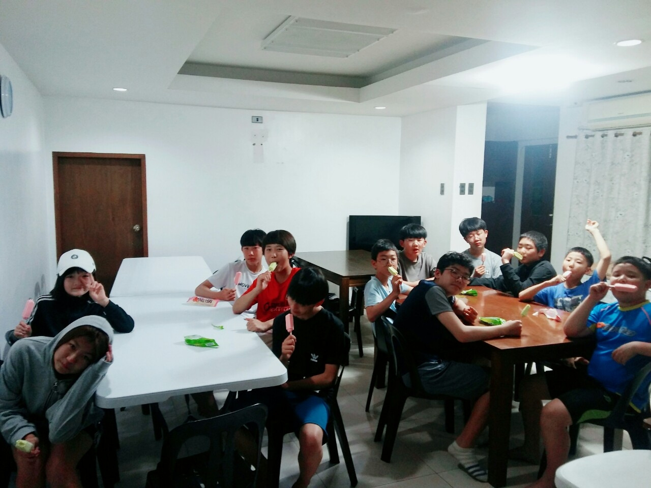 첫주 일요일 저녁, 단어테스트를 끝내고 힘든 아이들을 위해 아이스크림 시간을 마련해 준 관리 선생님들, 10시 정도가 되면 규칙적으로 취침을 하게 된다.(출처:NIS 캠프 밴드)