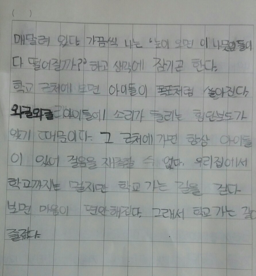 우리 집에서 학교까지는 멀지만 학교 가는 길을 걸으면 마음이 편안해진다. 그래서 학교 가는 길이 즐겁다.