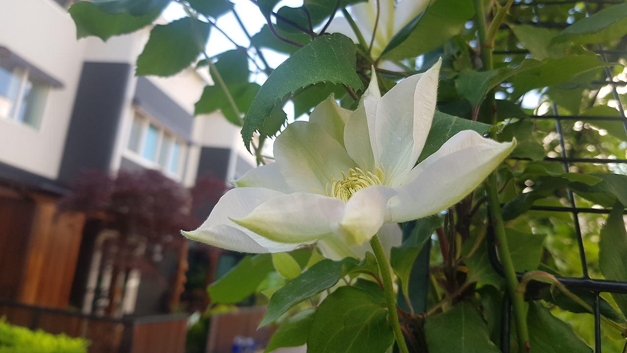 <앞뜰 아치에서 넝쿨장미와 함께 사는 클레마티스 백설공주: 5월 초 개화, 5월의 봄꽃>