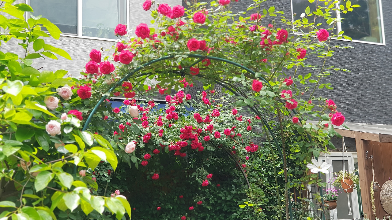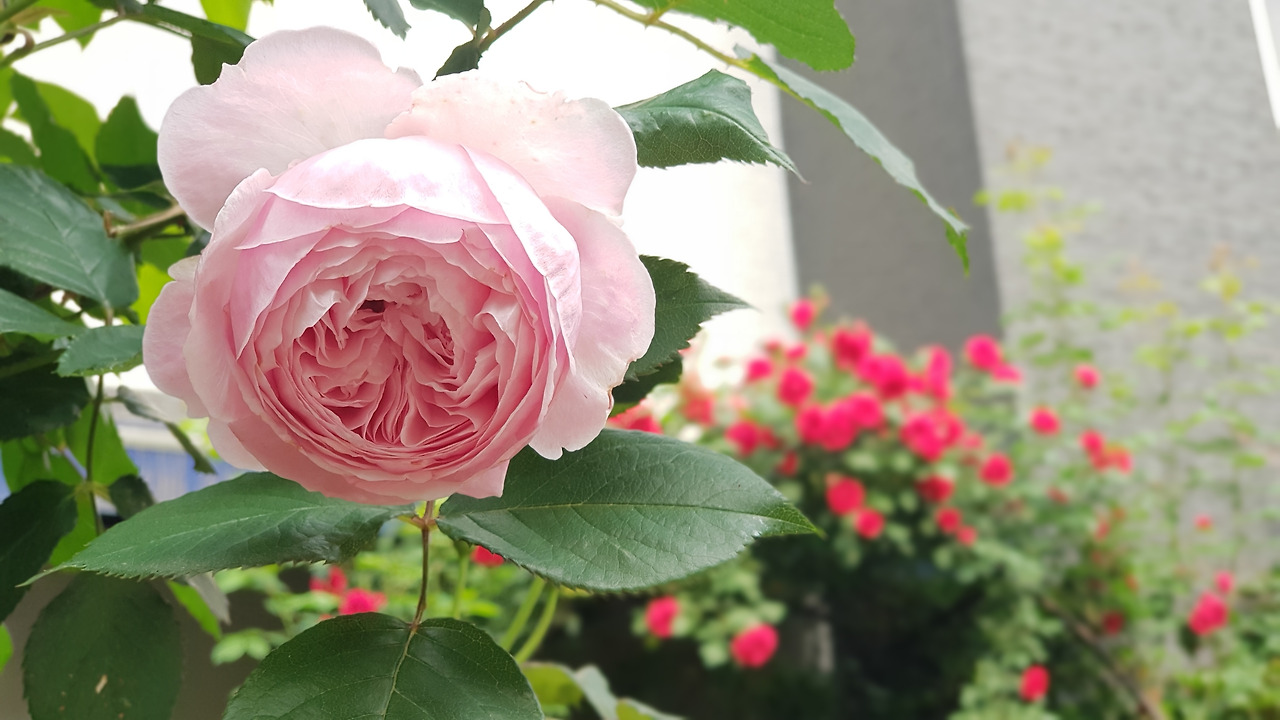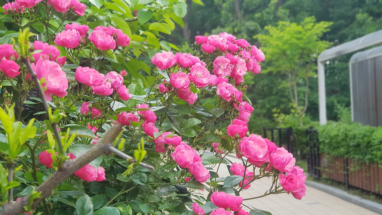 <정문과 앞마당에 활짝 핀 줄기장미와 분홍색 영국 오스틴장미, 5월의 봄꽃>