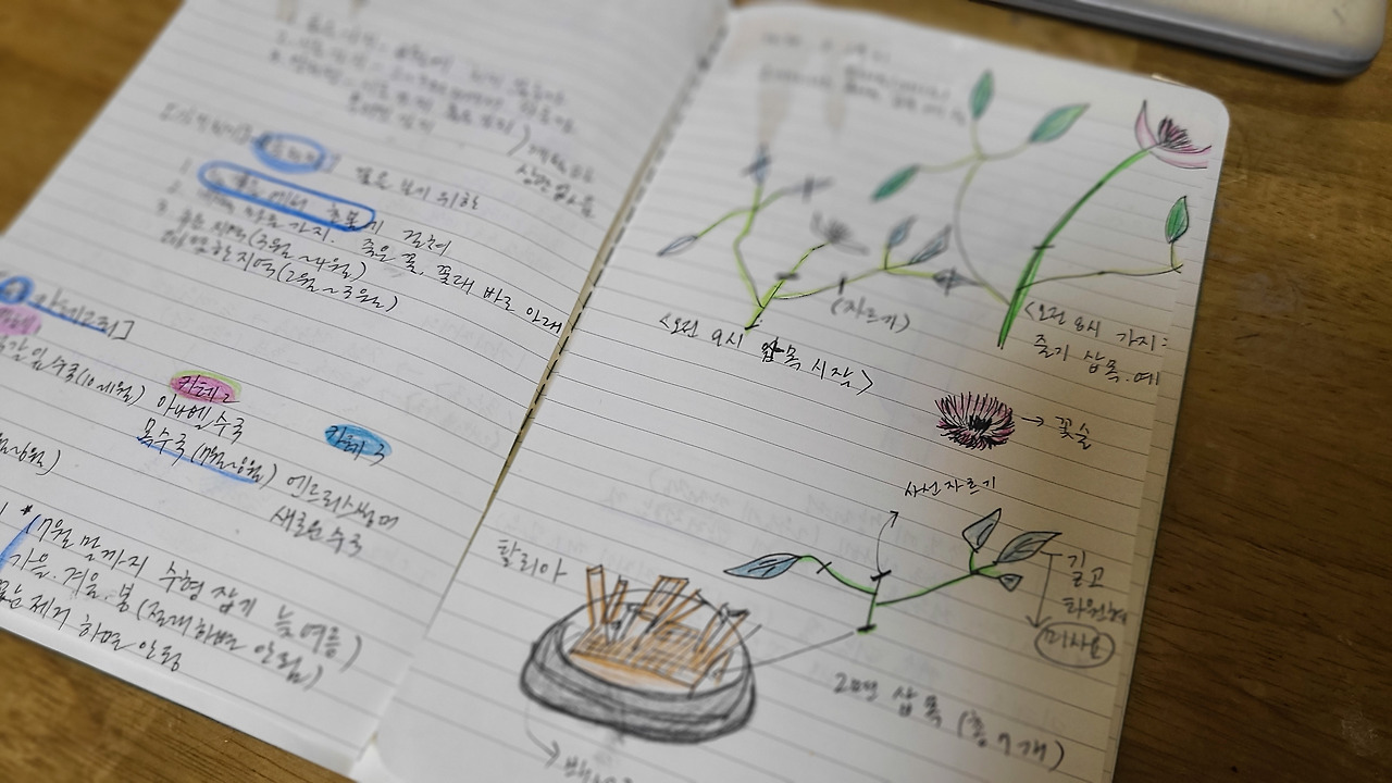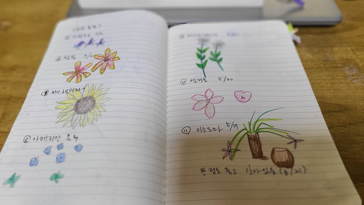위의 노트의 날짜별 내용을 살펴보고 있자니, 내가 얼마나 클레마티스(큰꽃으아리)와 양귀비꽃를 아끼고 사랑하는지도 알 것 같다. 그림도 그리지 못하는 내가 나름 정성스럽게 보이도록 그려놓았다니. 분명히 기분이 좋았던 날이었으리라. 그날 노트에게 향하는 영양분이었을 것이다.