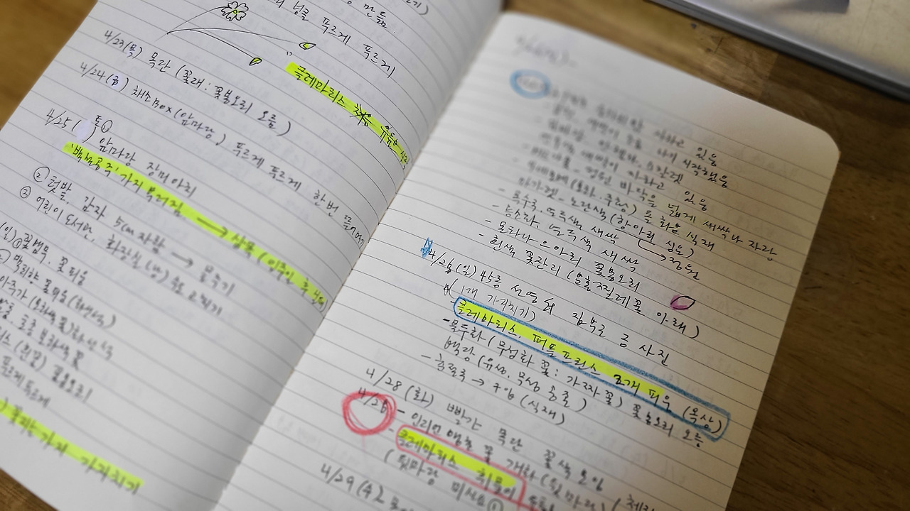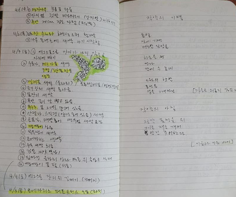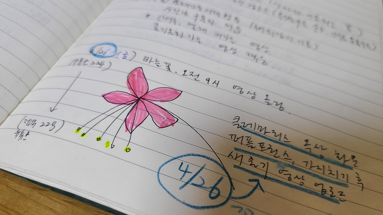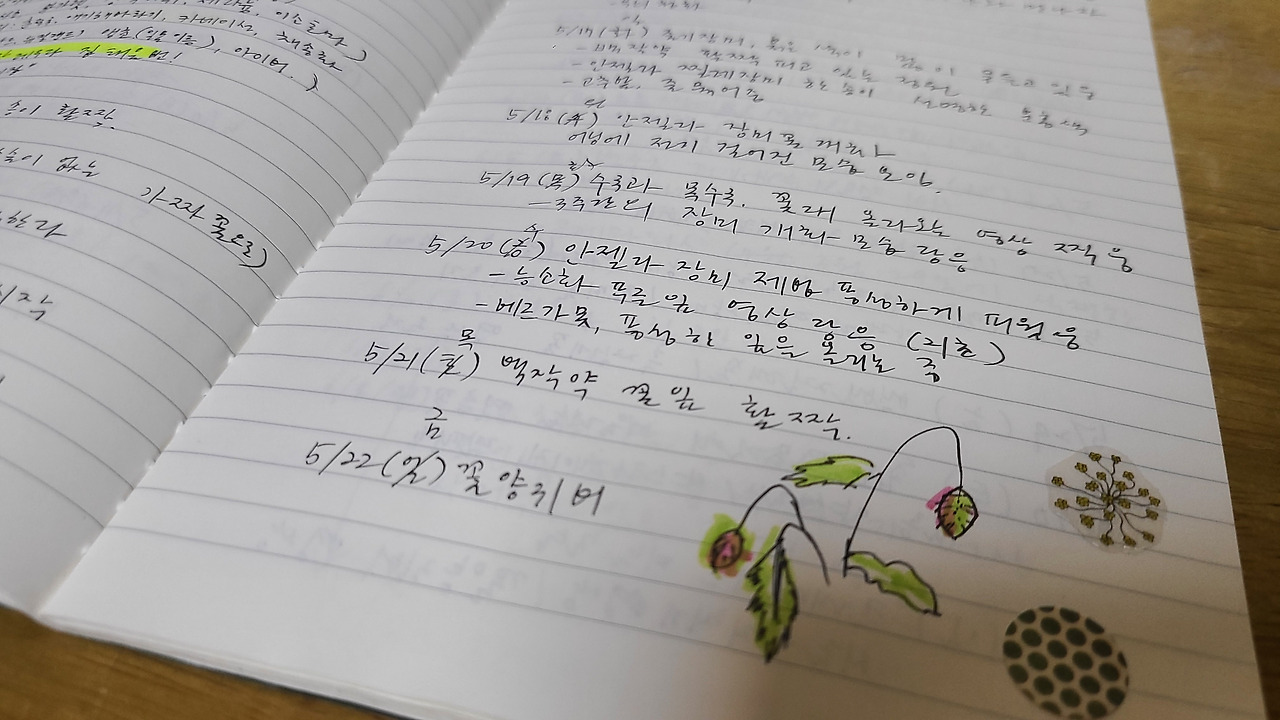 나는 정원의 모습을, 야생화 생장 상태와 꽃의 개화의 풍경을 찍는 거에 멈추지 않고 정원 노트를 기록하기에 이르렀다. 처음에는 날짜별로 꽃들의 성장과 개화하는 모습, 특이사항을 적기 시작했다.