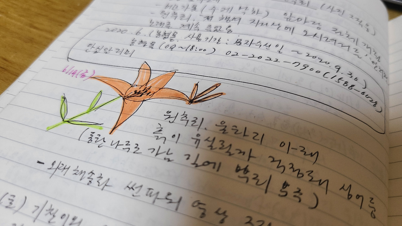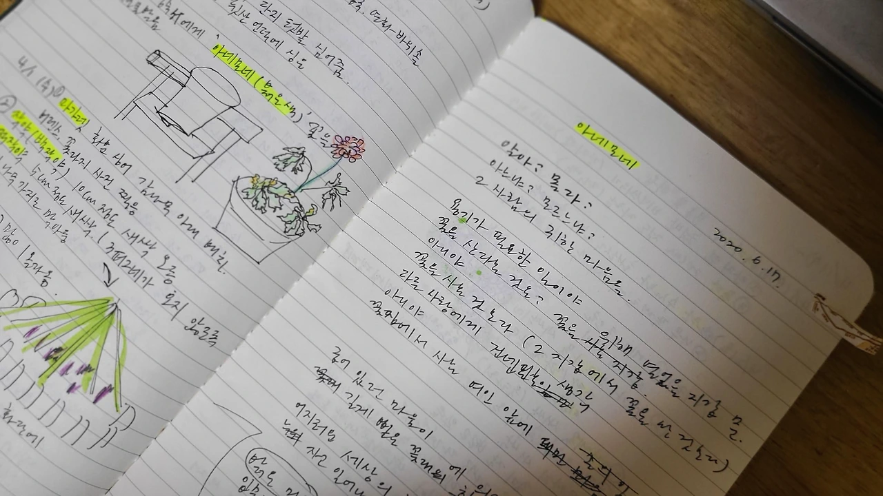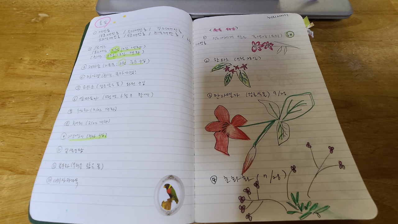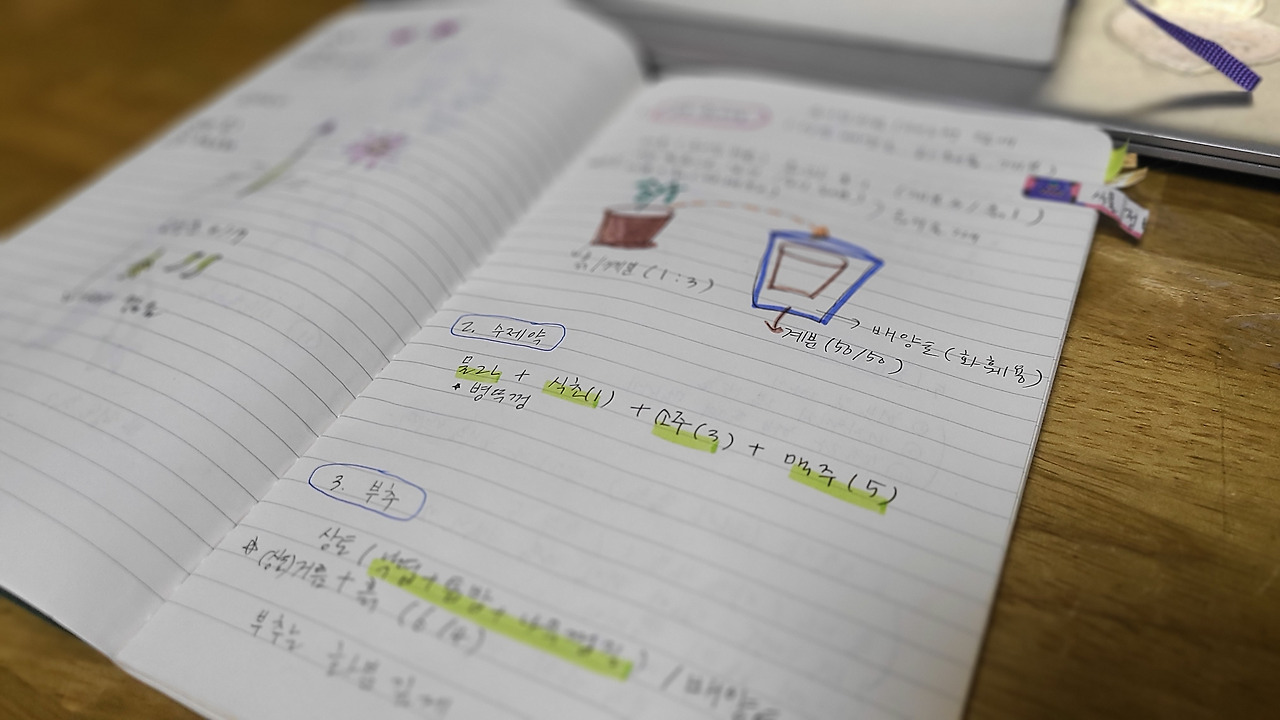 여러 매체를 통해 알게 된 정보는 정보창으로 구분을 해서 적어두었다. 예를 들면, 화분에 흙을 섞는 양, 흙의 종류, 수제 약품 만드는 방법 등에 대한 관심을 적어두고 두고두고 보고 있으니 재미있다. 그림도 그려서 넣어두니 꼭 중고등 학생 때로 돌아가 노트를 꾸미며 필기를 하고 있는 청춘이 살짝 스치고 지나간다.