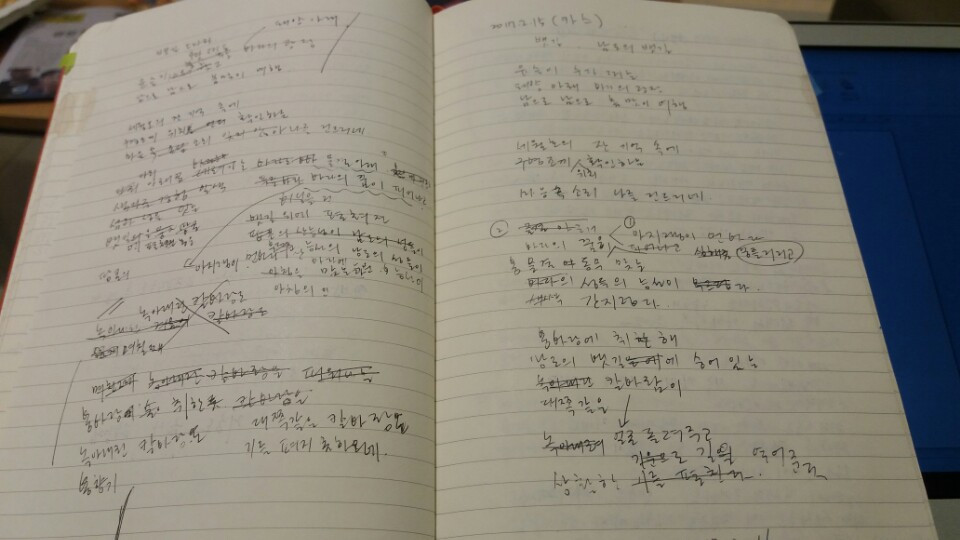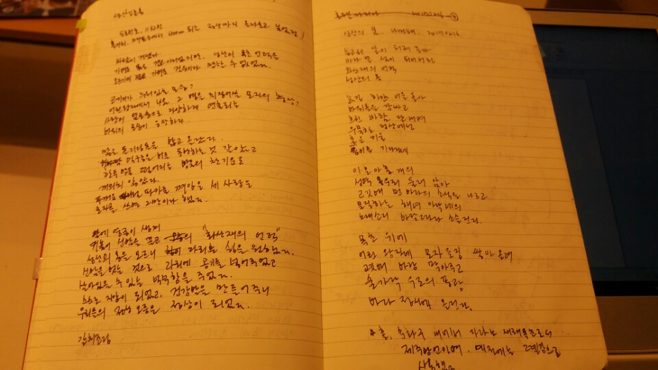 노트의 여행은 녹동항(전남 고흥군 녹동읍 소재)에서 제주로 가는 남해고속카페리호의 바다 위에서 시작되었다. 주인의 친정 집에서 10분 정도의 지근거리에 있는 항이지만, 오전 9시 출발이니 한 시간 전까지 선적할 차를 데리고 가야 하는 마음이 급하지 않을 수 없었다. 급했지만 그녀는 지갑과 노트를 잊지 않았다. 핸드폰 메모장에 긁적이면 더욱 경제적일 것 같긴 하지만, 그녀는 그래도 노트를 좋아했다. 펜으로 글이 감기는. 그 여백의 채워짐을 행복으로 먹고사는 주인. 배 안에서 포켓몬을 잡는 놀이에 빠져 있는 두 남자들과 떨어져 '남도의 뱃길'이라는 시가 탄생했다.