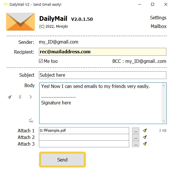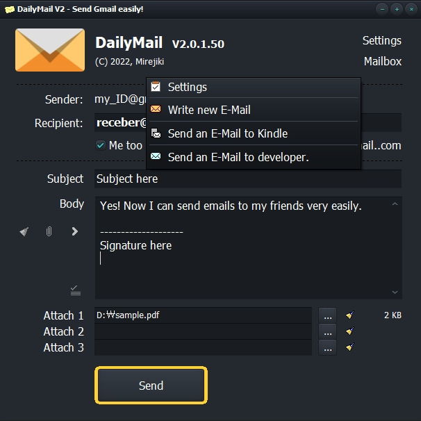 DailyMail The DailyMail is a utility that makes it easy to send gmail without logging in.1. Unzip it.2. Set up your gmail account in the [Settings].3. Put it in USB flash drive.4. Done.Easily send mail anytime and anywhere!Version : 2.0Release date : 2022.July...