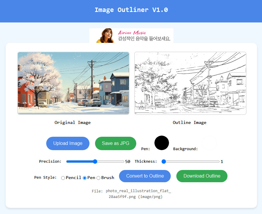 이미지를 업로드하면 외곽선 이미지로 만들어 주는 서비스입니다. 사진보다는 일러스트레이션 그림이 더 잘 되는군요. 특별히 넣은 [Save as JPG] 기능은 업로드한 이미지를 무조건 Jpeg 이미지로 변환해서 저장하는 기능입니다.