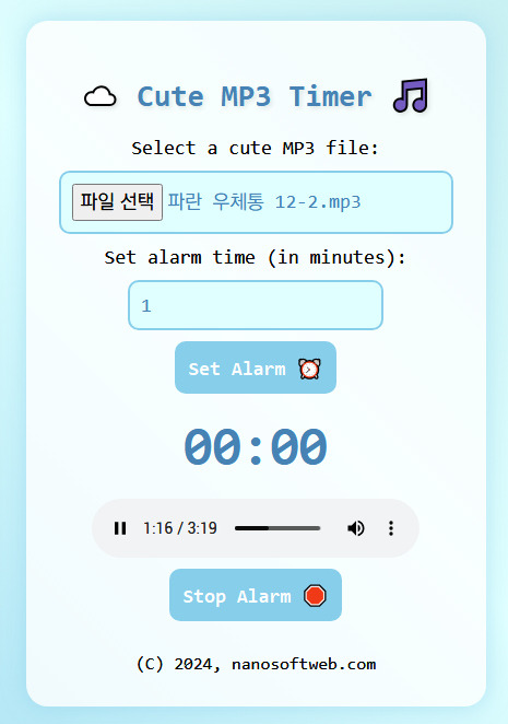PC나 스마트폰에 있는 mp3 파일로 타이머를 설정하는 서비스입니다. 분 단위로 시