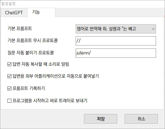 예를 들어, 기본 프롬프트를 "다음을 영어로 번역해 줘."라고 설정해 놓고, [질문 자동 붙이기 프로토콜]을 'juliann/'으로 설정합니다. 그리고 [기본 프롬프트 무시 프로토콜]을 '//'으로 설정합니다. 그렇게 하면 다음과 같이 두 가지 방식으로 프롬프트를 작성할 수 있습니다.