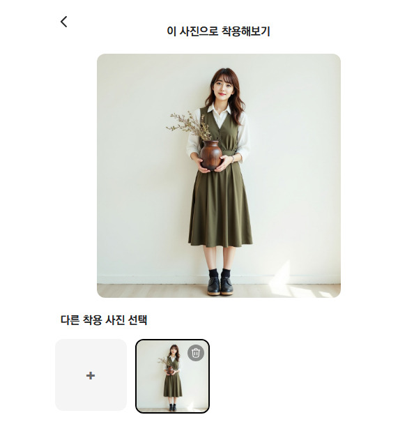 4. 모델/캐릭터 사진을 업로드하면 아래와 같은 페이지가 보입니다. 다른 모델을 또 추가하고 싶다면 밑의 [ + ] 버튼을 눌러 다른 모델/캐릭터 이미지를 업로드합니다. 업로드한 사진을 선택하고 '이 사진으로 적용해보기' 왼쪽에 있는 [ < ] 아이콘을 누릅니다.