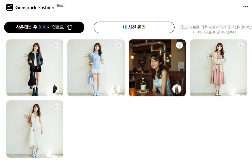 화면 왼쪽 위의 [Genspark Fashion] 아이콘을 누릅니다. 그러면 Genspark Fashion 메인 페이지가 표시됩니다. 모델/캐릭터는 조금 아까의 작업으로 인해 이미 선택되어 있는 상태이므로, 메인 페이지에서 원하는 이미지 위에 마우스를 놓고 [착용해보기] 버튼만 누르면 됩니다. 그렇게 하면 선택한 이미지의 의상을 입은 모델/캐릭터가 또 하나 생성됩니다.