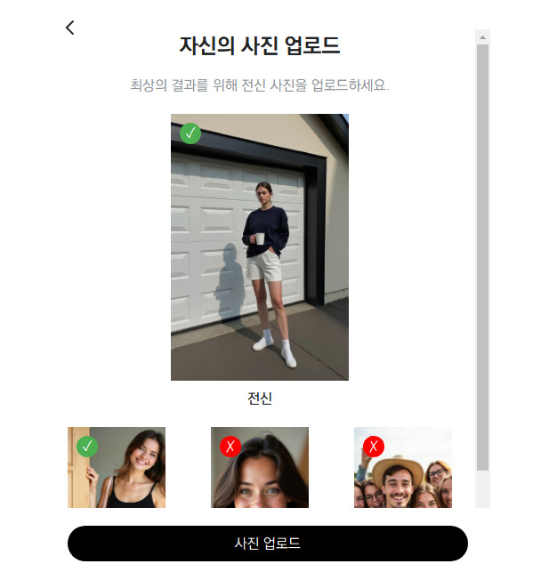 3. 처음 사용자라면 옷을 입어볼 모델이 없으니, 아래와 같은 페이지가 보일 것입니다. 밑의 [사진 업로드] 버튼을 눌러서 옷을 입어 볼 모델/캐릭터 사진을 업로드합니다.