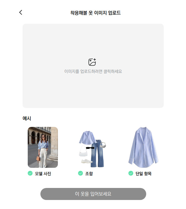 5. 돌아온 페이지에서 [적용해 볼 이미지 업로드] 버튼을 누릅니다. 그러면 아래와 같은 페이지로 바뀝니다. 이 페이지에서 가운데에 있는 이미지 아이콘을 눌러서 원하는 의상 이미지를 선택합니다. 그리고 [이 옷을 입어보세요] 버튼을 누릅니다.
