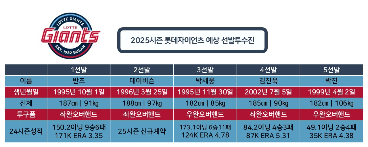 무엇보다 국내 에이스인 박세웅이 분전을 해줘야 한다. 2024시즌, 이닝 소화에 있어서만큼은 자신의 몫을 다 했지만, 한 경기 내에서도 갑자기 밸런스가 오락가락하는 등 내용상으로는 불안한 모습을 자주 노출했다. 박세웅은 팀의 변수가 되어서는 안되는 선수다. 다른 핑계를 댈 수가 없다. 에이스는 무조건 잘해야 한다. 에이스가 흔들리면 단순히 한 선수가 흔들리는 걸 넘어서 팀의 근간이 흔들리게 된다.개인적으로는 박세웅이 24시즌보다는 안정적인 모습으로 25시즌을 치러내지 않을까 예상한다. 본인을 위해서나, 팀을 위해서나 꼭 그래야 한다.