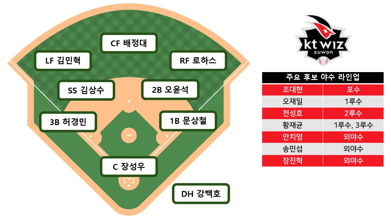 이 뿐 아니다. 타이브레이크를 거치고 와일드카드 결정전을 이긴 다음 준플레이오프 5차전을 진행하는 동안 장성우는 포수 마스크를 벗을 수가 없었다. 어느 순간 이후로 장성우의 체력이 완벽하게 고갈되었음을 모두가 느낄 수 있었다. 그러나 새 시즌에는 백업포수가 강백호여서는 절대 안된다. 그만큼 팀에 선수가 부족하다는 뜻이겠으나, 급할 때일수록 순리대로 가야지 서두르다가는 도리어 일을 더 크게 망칠지도 모른다.