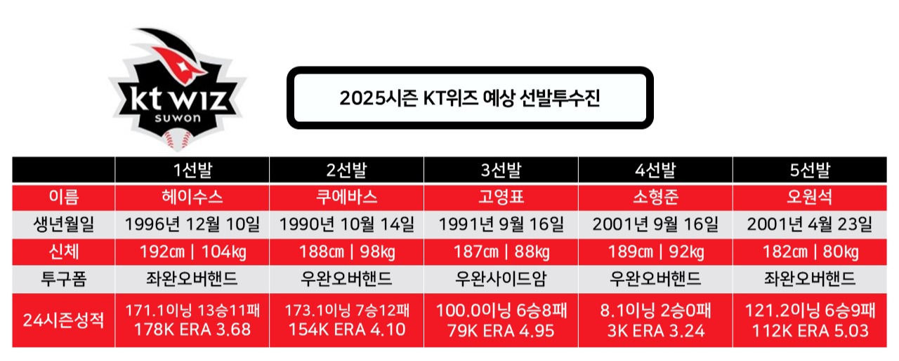 KT위즈의 웨스 벤자민은 구위만큼은 리그를 '씹어 먹어도' 남는 투수라는 평가를 받아왔지만, 1선발은 언제나 쿠에바스였다. 2024시즌을 마치고 벤자민과의 결별을 선택한 KT위즈는 키움히어로즈에서 풀린 외국인 투수인 엔마누엘 데 헤이수스를 영입하는 데 성공했다. 2024시즌 전반기보다 후반기 성적이 좋지 않았다는 부분에서는 우려할만한 지점이 있겠으나 그보다는 이미 리그 적응이 끝난 선수라는 점과 KT위즈에는 부족한 좌완투수라는 점이 더 큰 장점으로 작용할 것으로 보인다.