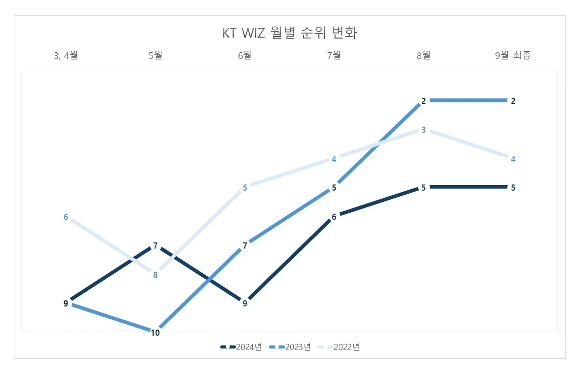 가장 옅은 색 그래프는 2022시즌, 중간은 2023시즌, 가장 진한색 그래프는 2024시즌 KT위즈가 그린 월별 순위변화다. KT위즈는 2021시즌 우승 이후 세 시즌 동안 비슷한 패턴의 성적변화를 보이고 있다. 4-5월까지는 하위권에 머물다가 6월부터 치고 올라간다. 이를 두고 KT위즈의 이름 그대로 마법사의 '마법'이라 표현하는 경우가 많지만, 나는 이 패턴이 '시즌 후반 무리하게 치고 올라가며 선수를 당겨 쓴(특히 불펜진에서) 대가를 다음 해 시즌 초반에 후불하는 구조적인 문제' 때문에 보여지는 현상이라고 생각한다.