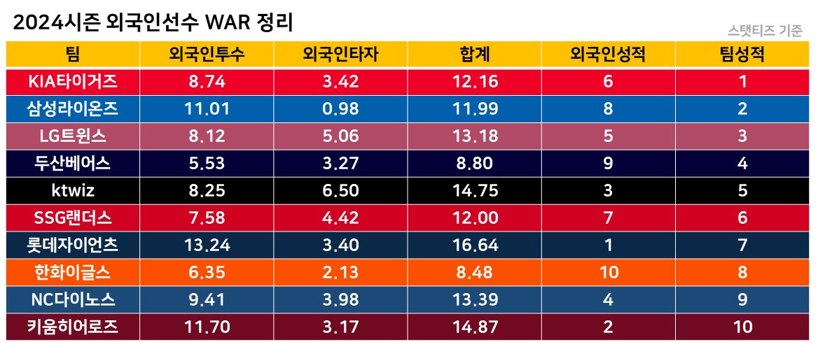 타팀에 비해 두산베어스와 한화이글스의 외국인 선수 기여도가 상대적으로 낮다. 그 중 외국인투수만 보면 꼴지가 바로 두산베어스다.