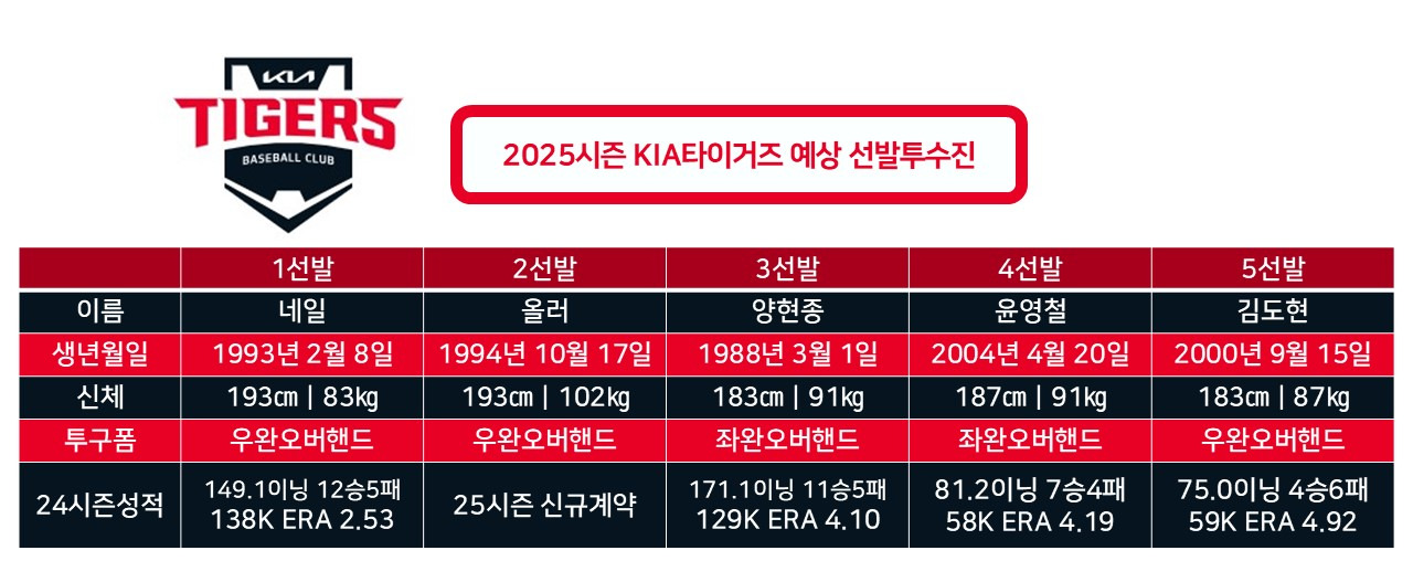 2024시즌까지 선발진의 중심에는 양현종이 있었으나 2025시즌부터는 큰 변화가 있을 것이다. 코칭스태프는 양현종의 소화 이닝을 줄일 것이라고 이야기했다. 연차에 따른 에너지레벨 저하는 필연적인 일이라 양현종으로서도 이제 170이닝씩 던지는 일은 그만둬야 할 것이다. 양현종으로부터 빠져나올 20-30이닝을 이젠 다른 선수들이 책임져야 한다.