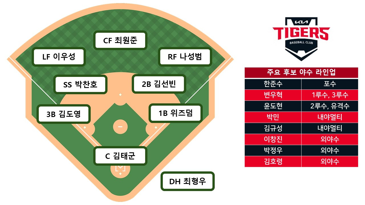 이우성은 조금 더 적극적으로 스스로의 기량에 대한 믿음을 가질 필요가 있다. 조심스럽고 소심한 성격이 기량을 억누르고 있는 느낌이다. FA 시즌을 맞는 최원준과 박찬호가 어떤 활약을 펼칠지도 관심사항이다. 한준수는 포수로서나 타자로서 더 성장하는 모습을 보여줘야 한다, 여기에 '안 아픈 윤도현'이 1군에서 어떤 모습을 보여줄지 여부가 가장 기대가 된다. KIA타이거즈는 워낙 주전 선수들의 자리가 공고한 팀인데 윤도현 같은 선수가 일종의 메기 역할을 해줘야만 타선 전체가 긴장감을 갖고 최고의 기량을 발휘할 수 있게 될 것이다.