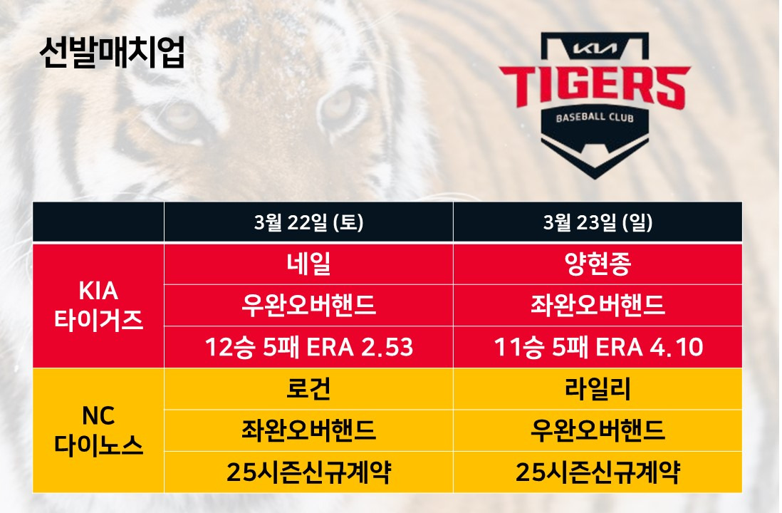일단 NC다이노스는 모두 신규 외국인 투수들이다. 워낙 외국인 선수를 잘 뽑아오는 NC다이노스라서 어떤 활약을 펼쳐줄지 기대가 되고, 동시에 2024시즌 최고의 화력을 뽐냈던 KIA타이거즈의 타선이 낯선 투수에게 얼마나 빠르게 대응을 해낼지도 관심이 간다.