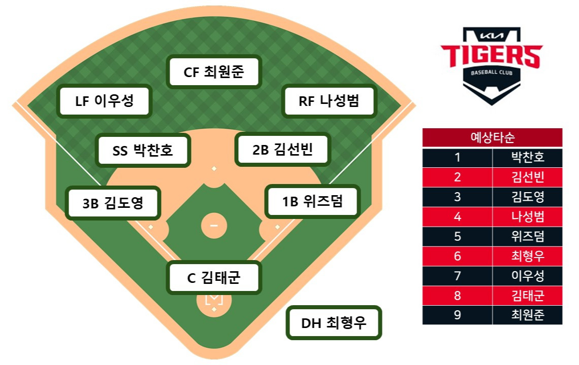 이번 야수 예상라인업은 NC다이노스와의 개막전을 상정하고 작성했다. 상대의 개막전 선발인 로건이 좌완투수이기에 우타자 위주의 라인업이 될 것으로 보이며, 그래서 김선빈을 2번으로 전진배치시켰다.